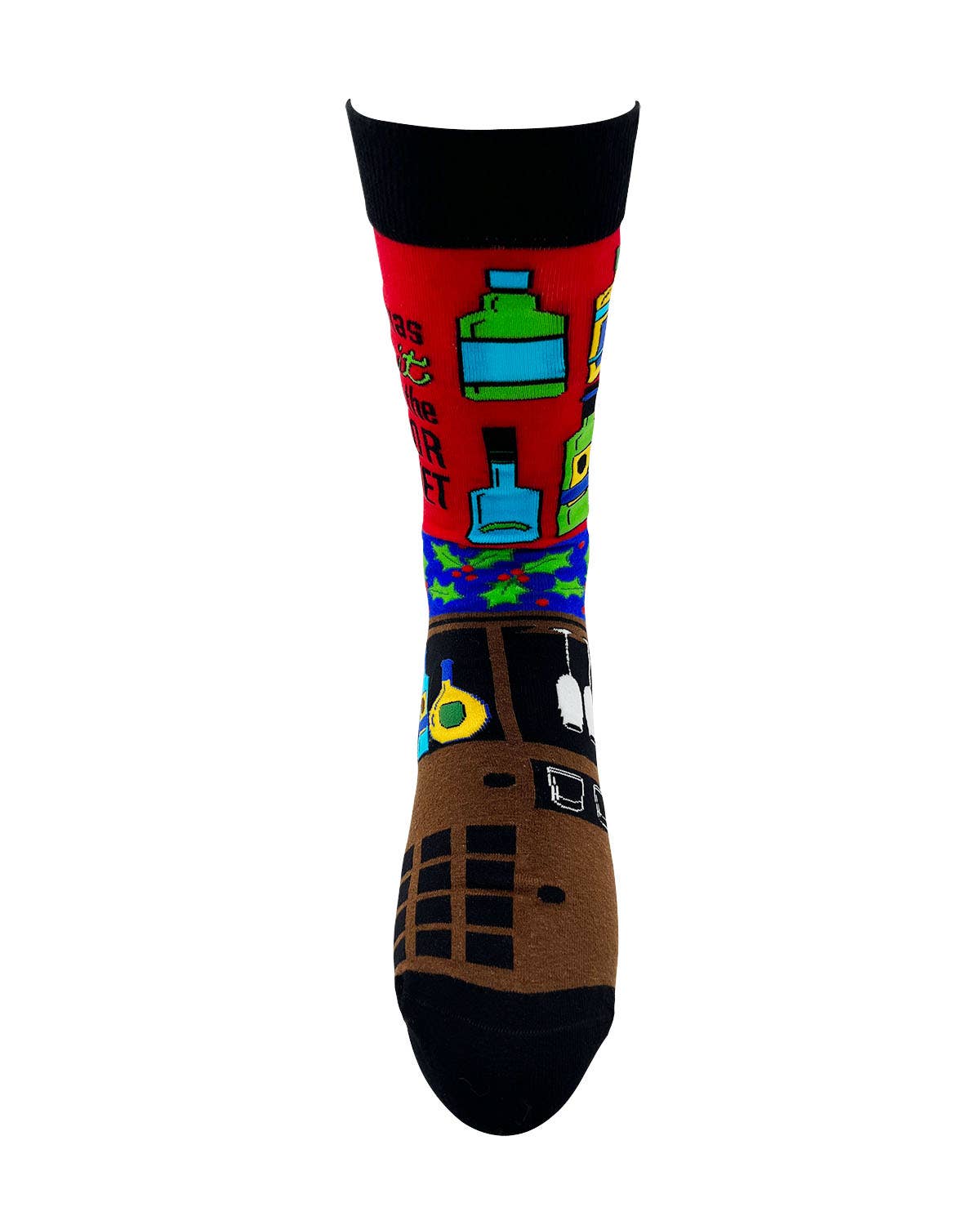 Men's novelty crew socks with saying "My Christmas Spirit is in the Liquor Cabinet." Stylish and comfortable! Fits men's shoe size 7 to 12. 80% Cotton, 15% Nylon, 5% Spandex. Easy Care - Machine Wash. Item # SK1064