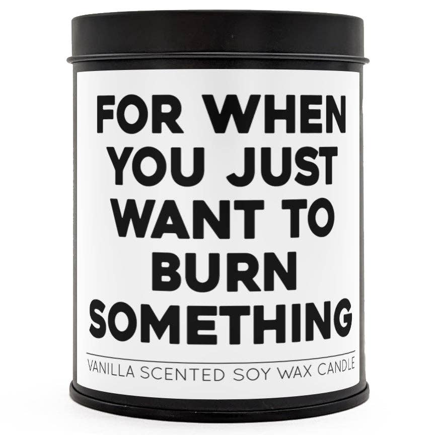 It's not arson when it's a candle. This 12 ounce candle comes in a sturdy black tin with lid. Each candle is hand poured vanilla soy wax with cotton wick and should burn for about 60 hours of enjoyment. They make great gifts for everyone from co-workers to family members. Plus, when the candle is finally gone, the tins make for very entertaining storage jars!