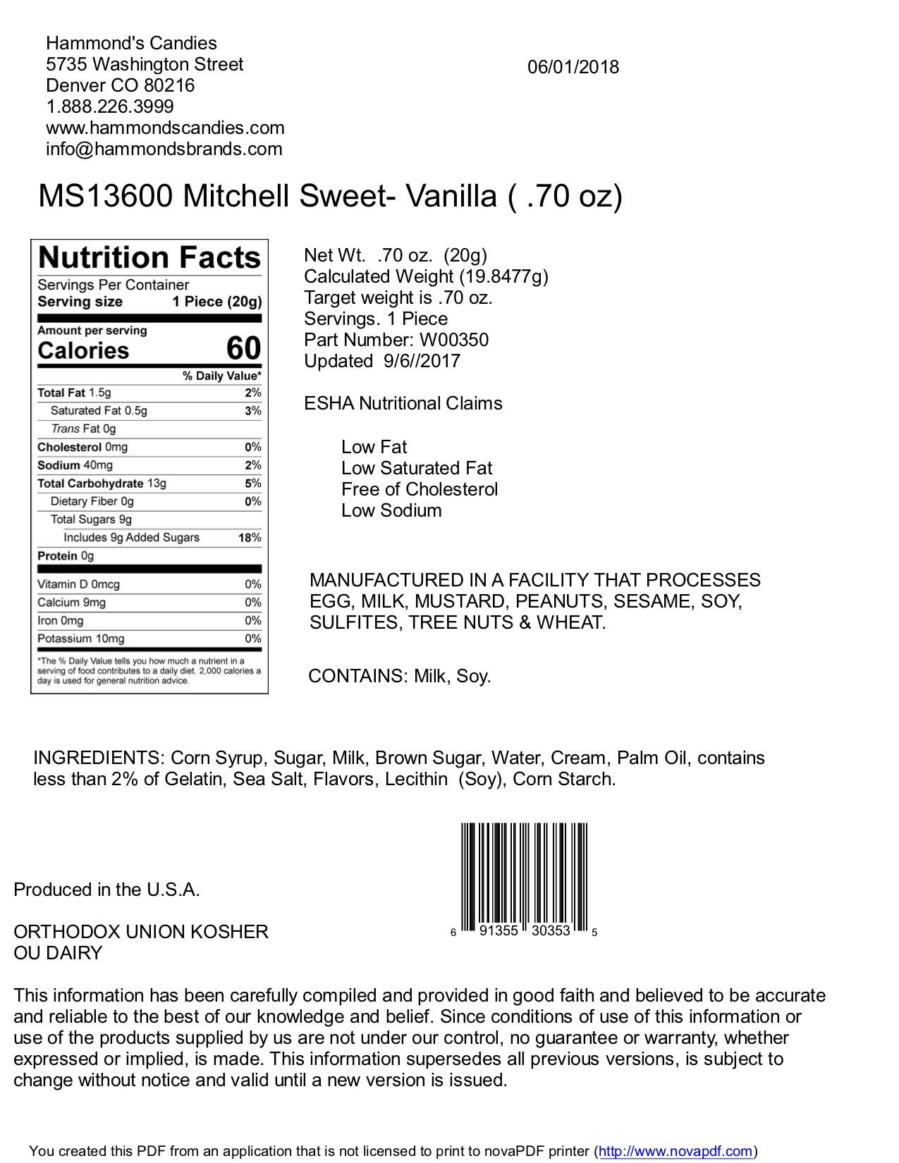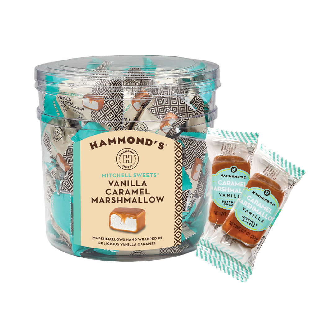 A proven best-seller, Mitchell Sweets Natural Vanilla Caramel Marshmallows deliver indulgence that moves quickly off shelves. Handmade marshmallows wrapped in sweet, chewy caramel offer a nostalgic flavor experience that resonates with customers across generations. For decades, Mitchell Sweets have been a Hammond's favorite, featuring handmade marshmallows wrapped in sweet, chewy caramel. The recipe was originally acquired by Carl Hammond from one of his close friends, Mitchell, hence the name Mitchell Sweets.