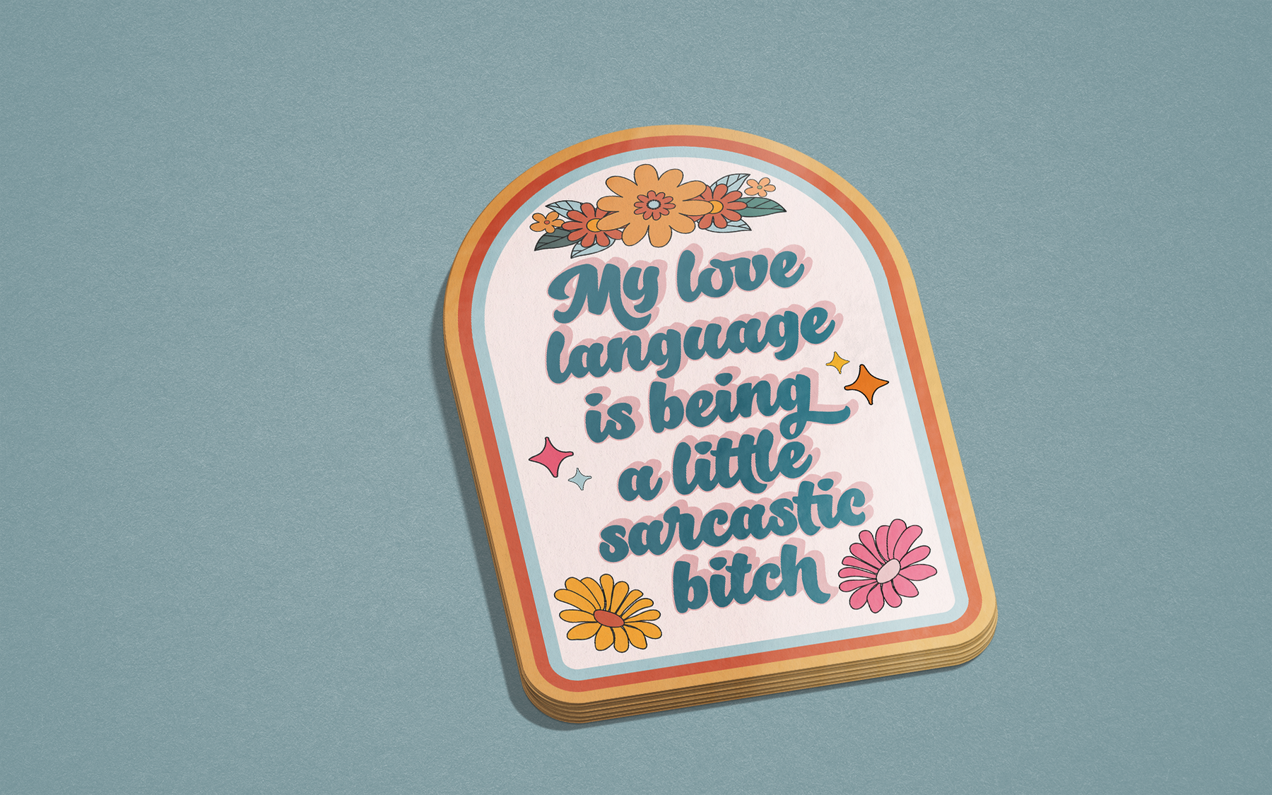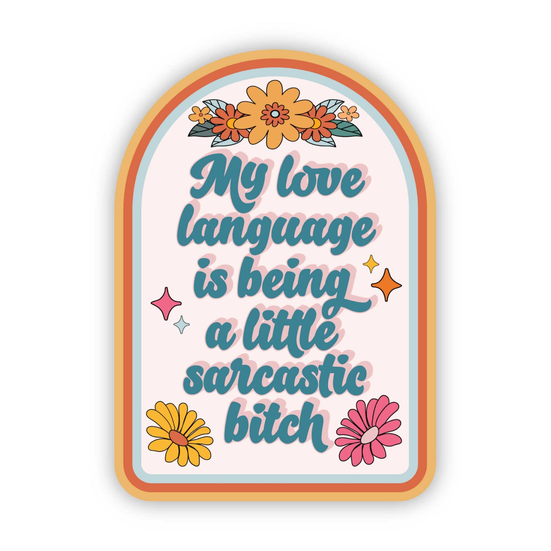 Get ready to wear your sarcasm with pride and make a bold statement with our "My Love Language is Being a Little Sarcastic Bitch" sticker! This badass sticker is designed for those who know how to wield sarcasm like a pro. With its vibrant retro color palette and unique arch shape, this sticker demands attention. Made from high-quality materials, it's built to withstand whatever life throws at it, whether it's rain, shine, or a sassy comeback. Embrace your snarky side and show the world that sarcasm is your love language. Stick it on your laptop, water bottle, or anywhere you want to make an unapologetic statement. It's dishwasher-safe and waterproof, so you don't have to worry about it losing its sassiness.