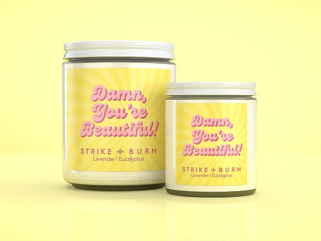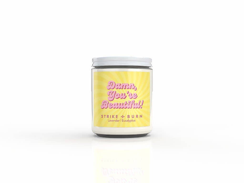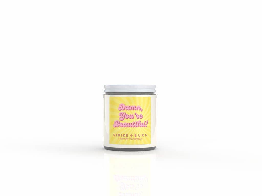 Damn You're Beautiful Candle Fragrance: Lavender & Eucalyptus Strike + Burn's Damn You're Beautiful Candle is as stunning as its name. Crafted with soothing lavender and energizing eucalyptus essential oils, this candle is your daily reminder of just how extraordinary you are. Light it, inhale its essence, and embrace your beauty and brilliance. Shine on, beautiful human—you've got this. Perfect self-care gift for anyone who deserves a confidence boost and moment of peace. Fragrance Notes: Lavender & Eucalyptus Top Note: Fresh eucalyptus – crisp, energizing, and clarifying with cool mintiness. Middle Note: Soothing lavender – calming, floral, and peaceful with herbal sweetness. Base Note: Lavender & eucalyptus blend – relaxing, uplifting, and restorative. What Makes Us Great: •USA-farmed, sustainably sourced coconut-soy wax — always paraffin-free. •Prop 65–compliant fragrances & essential oils — clean, safe, and smell amazing. •No parabens, phthalates, or BPA — ever. •Eco-friendly cotton wicks — for a clea