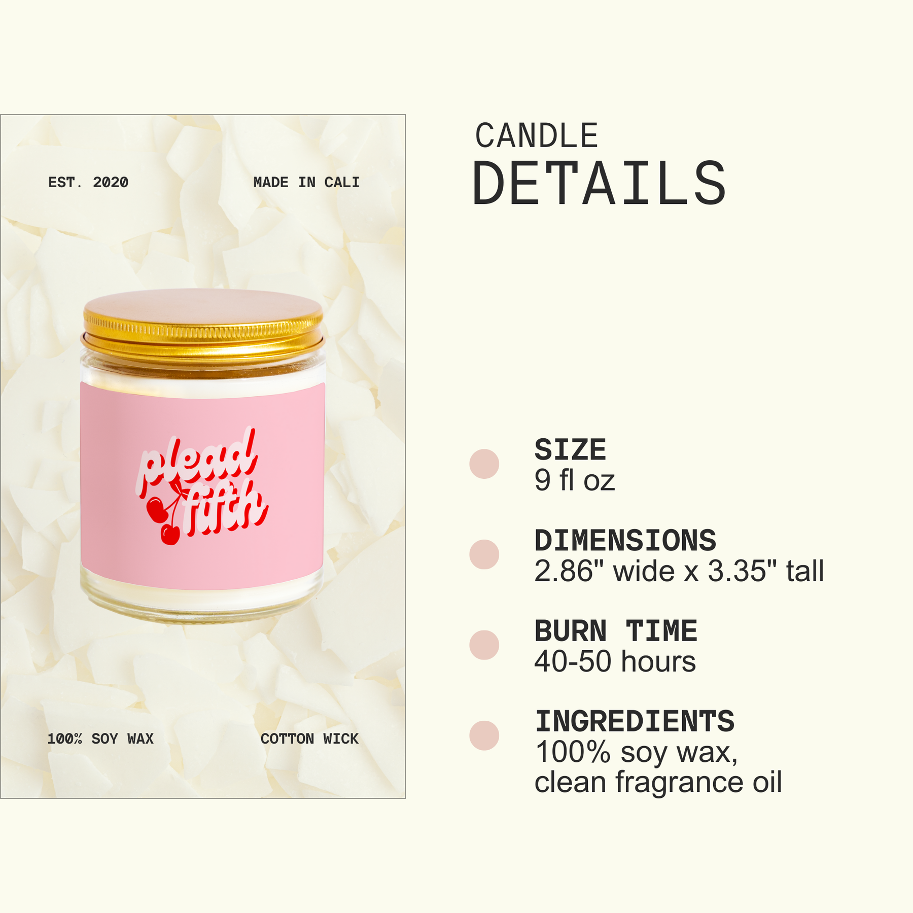 H A N D M A D E ∙ I N ∙ C A L I F O R N I A 🕯️ Our candles are hand-poured in-house by a talented all-women team, ensuring every piece meets our high standards of craftsmanship. 1 0 0 % ∙ S O Y ∙ W A X 🌿 We use 100% California-sourced soy wax for a clean, eco-friendly burn. V E G A N & C R U E L T Y - F R E E 🌱 No parabens, no phthalates, no parafin, and no compromises.
