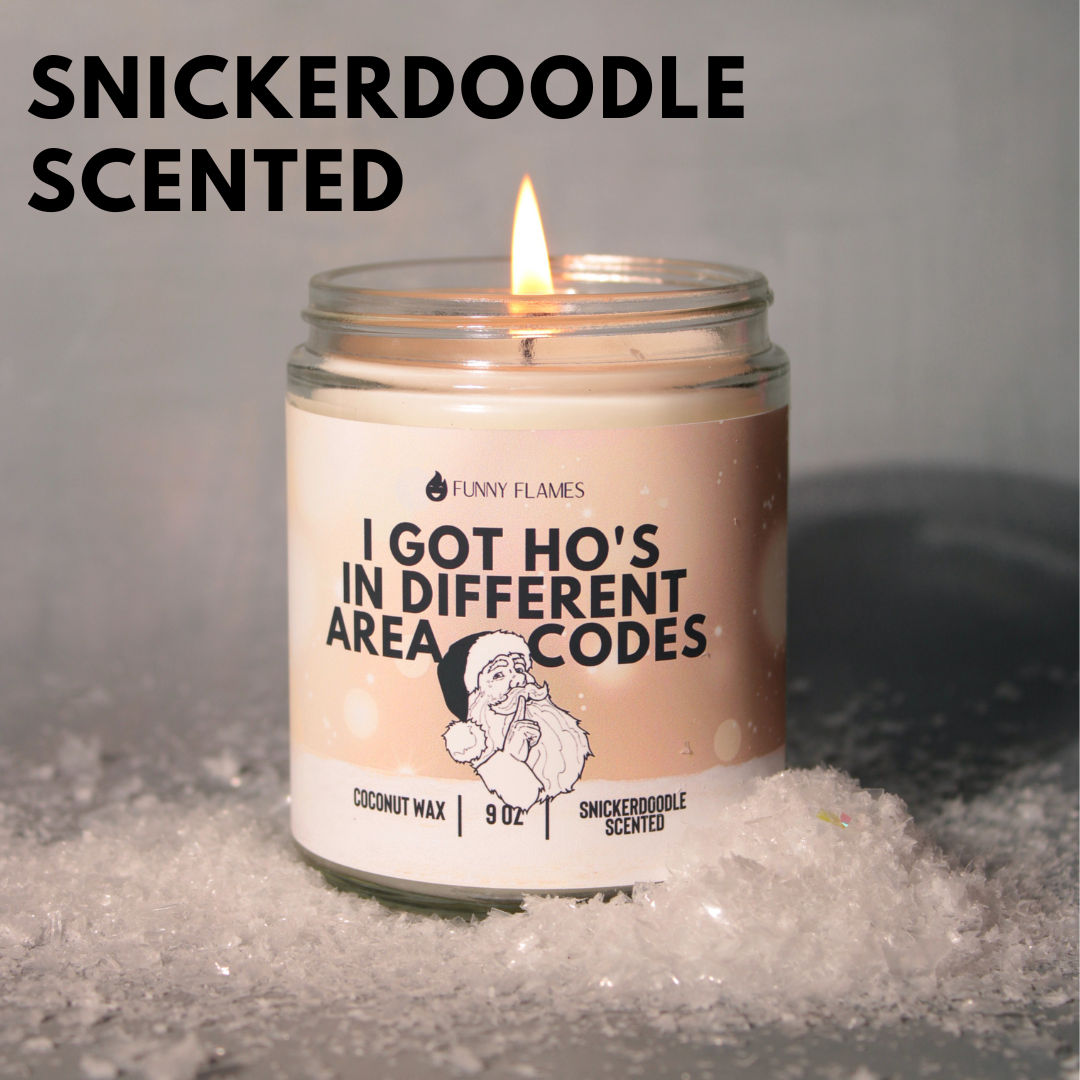 This tongue-in-cheek candle combines festive cheer with a dash of playfulness. Infused with the warm and inviting scent of snickerdoodle cookies, it fills your space with the delightful aroma of freshly baked treats. This candle is the perfect lighthearted Christmas gift that's sure to bring a smile to anyone's face. Whether displayed on a holiday-themed table or as a conversation starter during festive gatherings, "I Got Ho's In Different Area Codes" adds a touch of whimsy to the season. Spread laughter and holiday spirit with a gift that celebrates the fun side of Christmas and captures the essence of togetherness. Scent note: Snickerdoodle Size: 9oz Glass jar with lid Wax: Coconut apricot wax blend candle Dimensions 2.9x3.4 80+ hr burn time