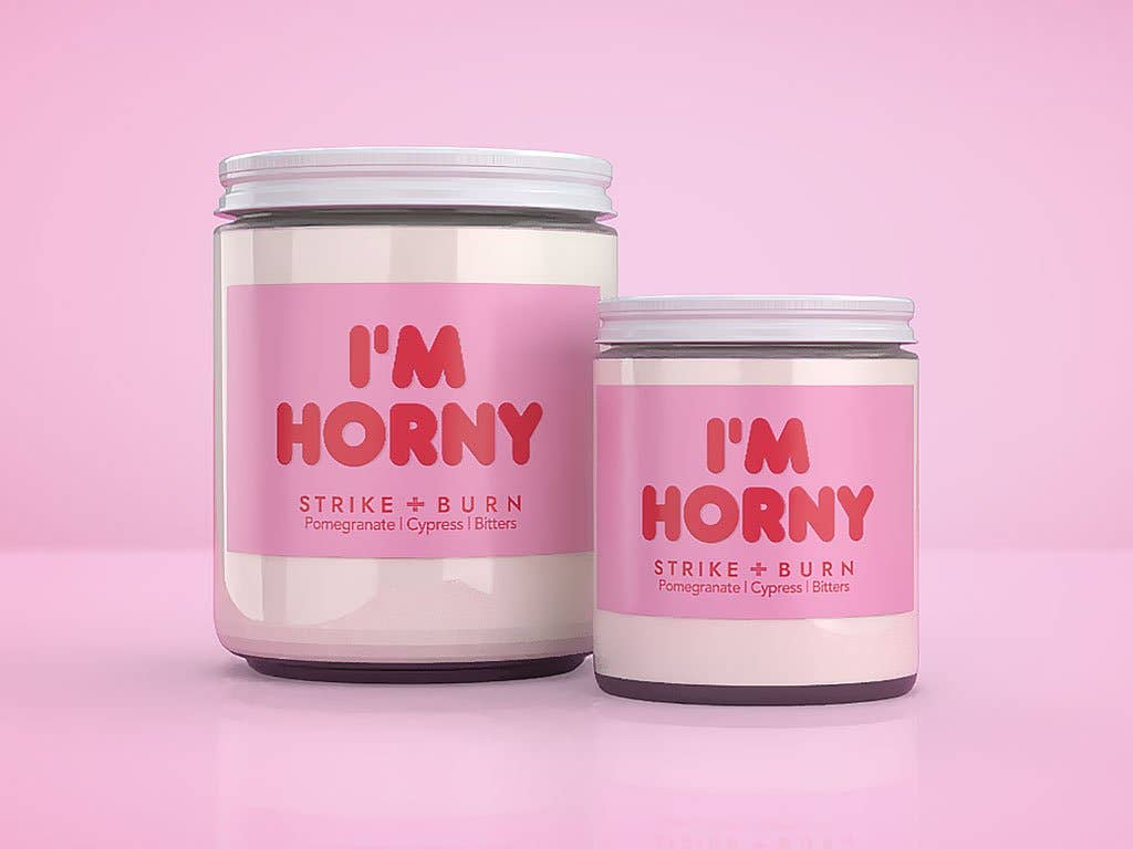 I'm Horny Candle Fragrance: Pomegranate, Cypress, & Bitters Feeling frisky? Light up the I'm Horny Candle and let the seductive blend of pomegranate, cypress, and bitters ignite your senses. Perfect for setting the mood—whether it's a night of romance or some well-deserved solo indulgence. Just don't forget to blow it out when the fun is over. Perfect romantic gift for special date nights, Valentine's Day, anniversaries, or whenever passion calls. Fragrance Notes: Pomegranate, Cypress & Bitters Top Note: Juicy pomegranate – bold, fruity, and seductive with tart sweetness. Middle Note: Earthy cypress – grounding, mysterious, and sensual with woody depth. Base Note: Aromatic bitters – complex, intriguing, and mood-setting with spicy warmth. What Makes Us Great: •USA-farmed, sustainably sourced coconut-soy wax — always paraffin-free. •Prop 65–compliant fragrances & essential oils — clean, safe, and smell amazing. •No parabens, phthalates, or BPA — ever. •Eco-friendly cotton wicks — for a cleaner, longer burn