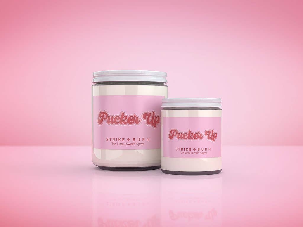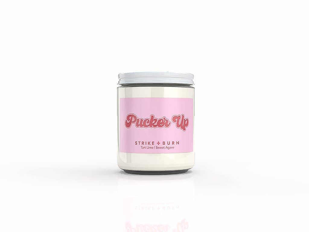 Pucker Up Candle Fragrance: Tart Lime, Sugar, & Agave A lover's must-have. The Pucker Up Candle by Strike + Burn is the ultimate lip-smacking treat, blending the tangy punch of tart lime, the sinful allure of sugar, and the sultry sweetness of agave. Get ready to pucker up for a lover's sweet surprise. Perfect Valentine's Day gift for couples, anniversaries, date nights, or romantic celebrations. Fragrance Notes: Tart Lime, Sugar & Agave Top Note: Tart lime – bright, tangy, and playful with citrus zing. Middle Note: Sinful sugar – sweet, indulgent, and lip-smacking with candy notes. Base Note: Sultry agave – smooth, romantic, and kiss-worthy with natural sweetness. What Makes Us Great: •USA-farmed, sustainably sourced coconut-soy wax — always paraffin-free. •Prop 65–compliant fragrances & essential oils — clean, safe, and smell amazing. •No parabens, phthalates, or BPA — ever. •Eco-friendly cotton wicks — for a cleaner, longer burn. •Cruelty-free & planet-friendly — because we actually give a damn. •Small