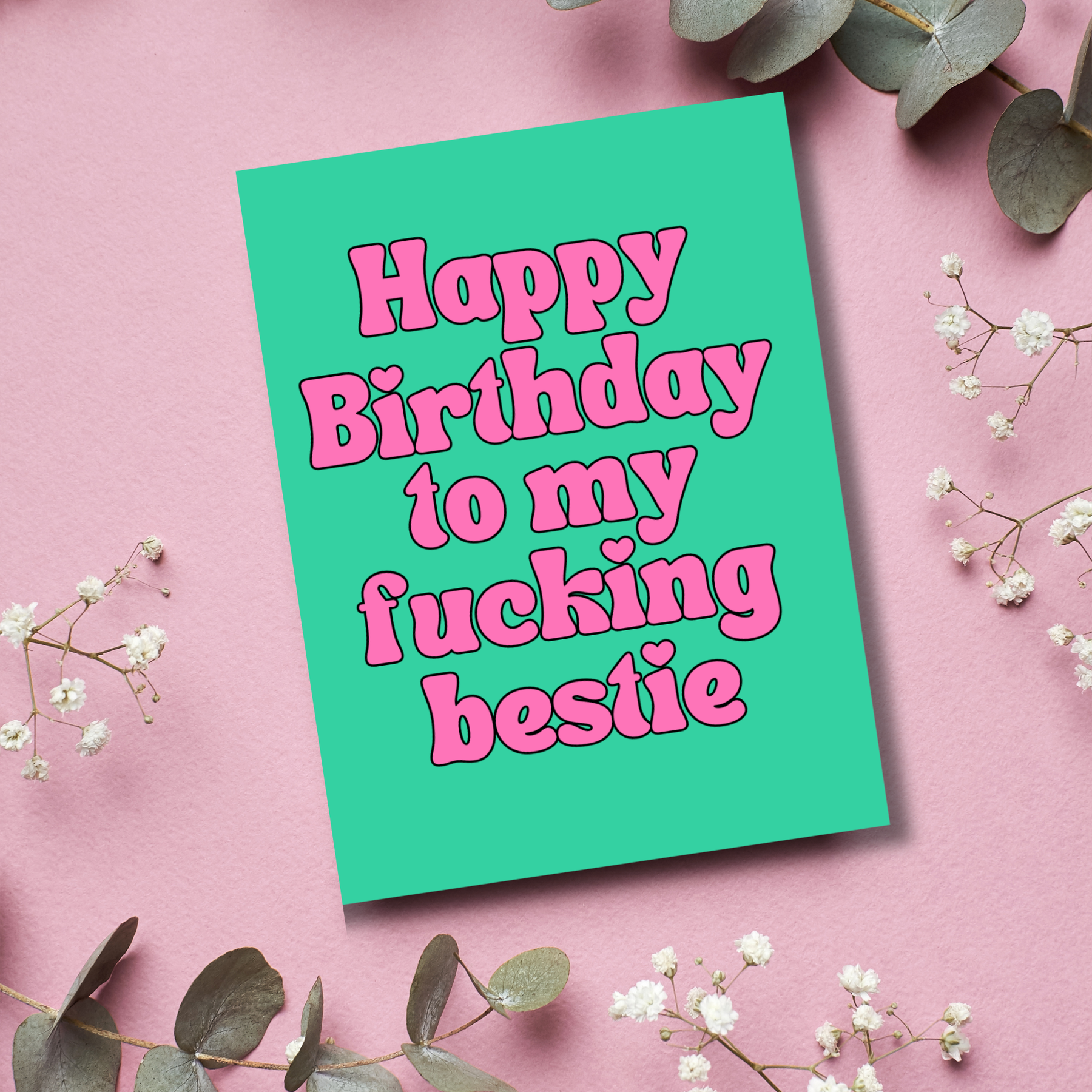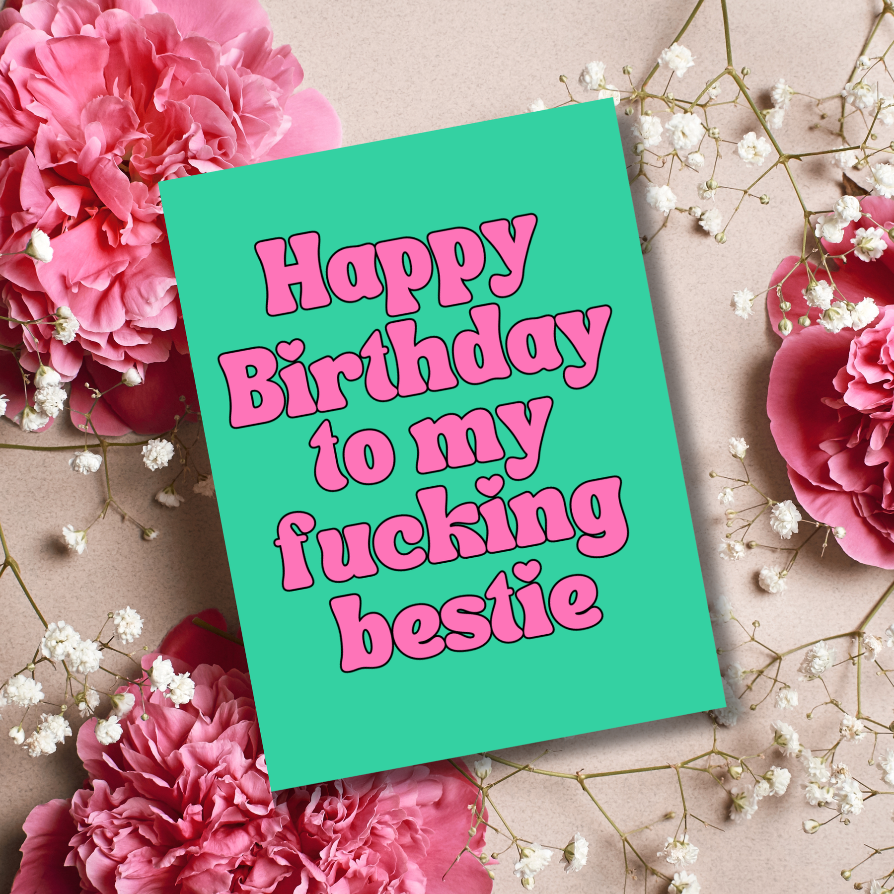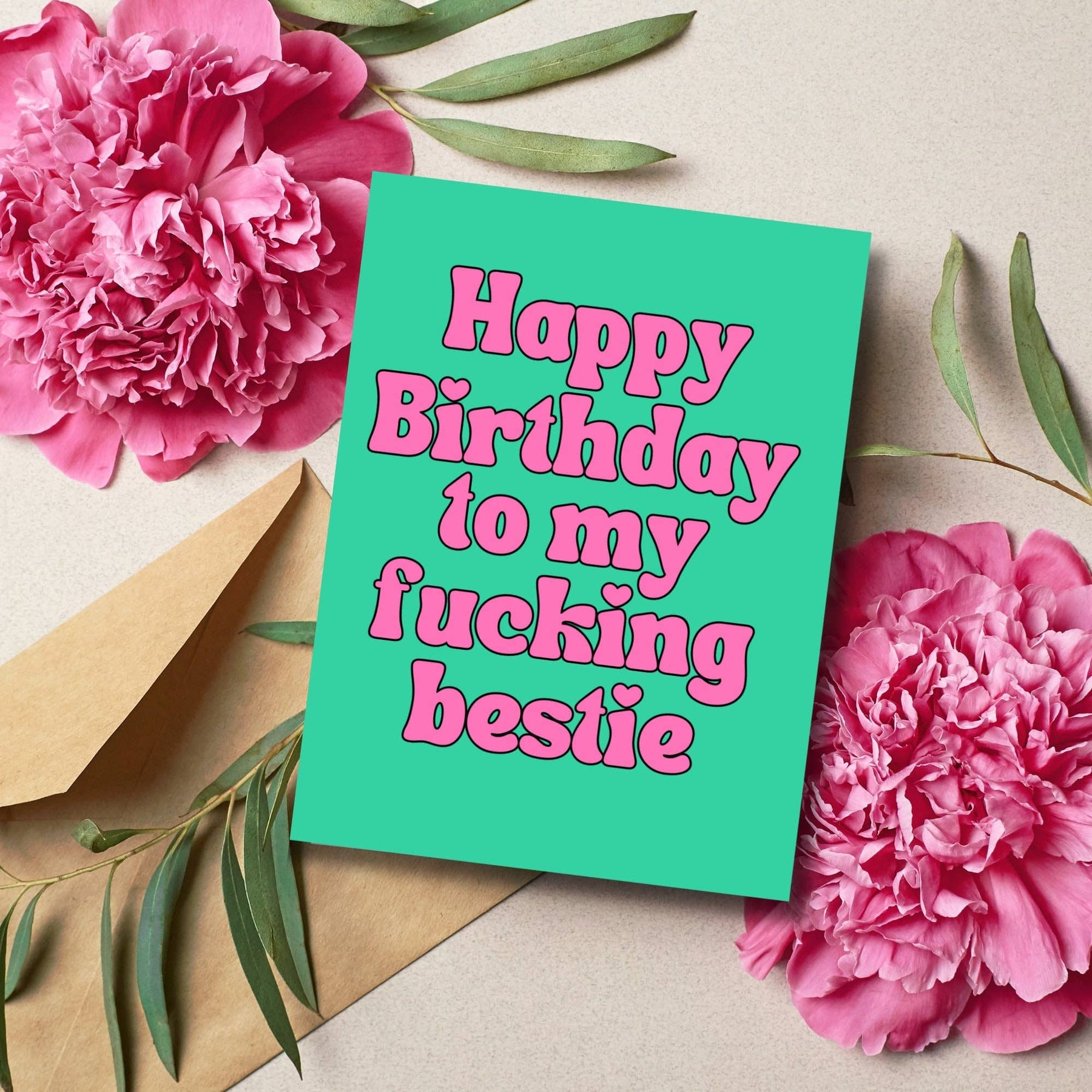 Card Details ↓ - Text: happy birthday to my fucking bestie - Inside: (blank) - Size: A2 (4.25in x 5.5in) Other Details ↓ - Comes with an extra kraft envelope - Wrapped in a cello sleeve for added protection