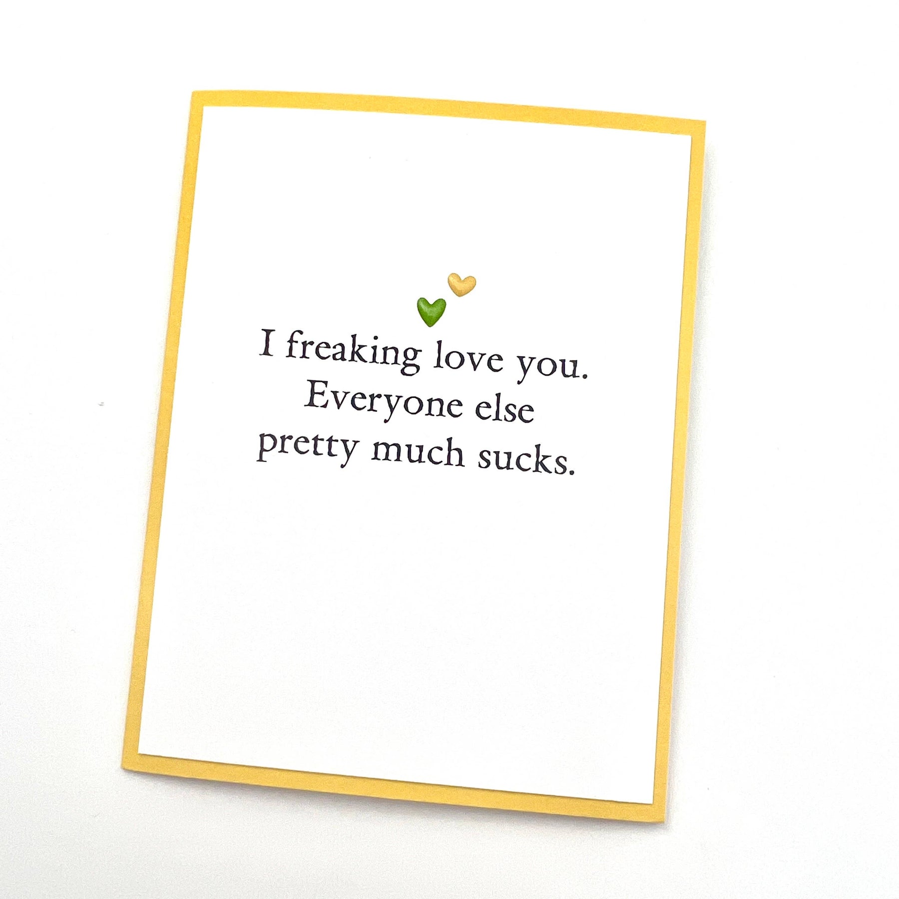 I freaking love you. everyone else pretty much sucks. For friends or lovers that need to hear this from you!. Each card is handmade with high-quality acid-free cardstock using laser-printing, archival adhesive, and embellishments. Cards are all blank inside and are shipped with a recycled envelope in an eco plant-based cellophane sleeve. [card size] 4.25 in x 5.5 in - a2. [envelope color] recycled kraft brown. [envelope size] 4.375 in x 5.75 in - a2. [material] paper. [inside] blank.