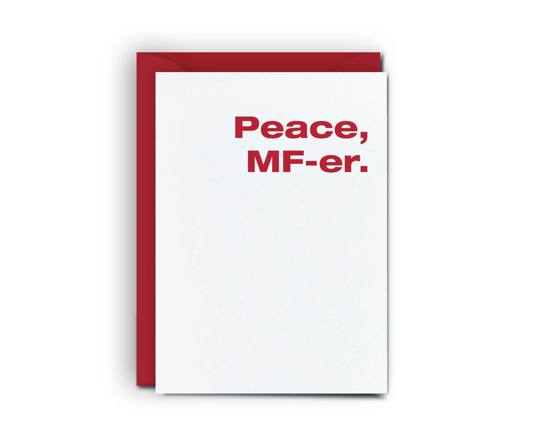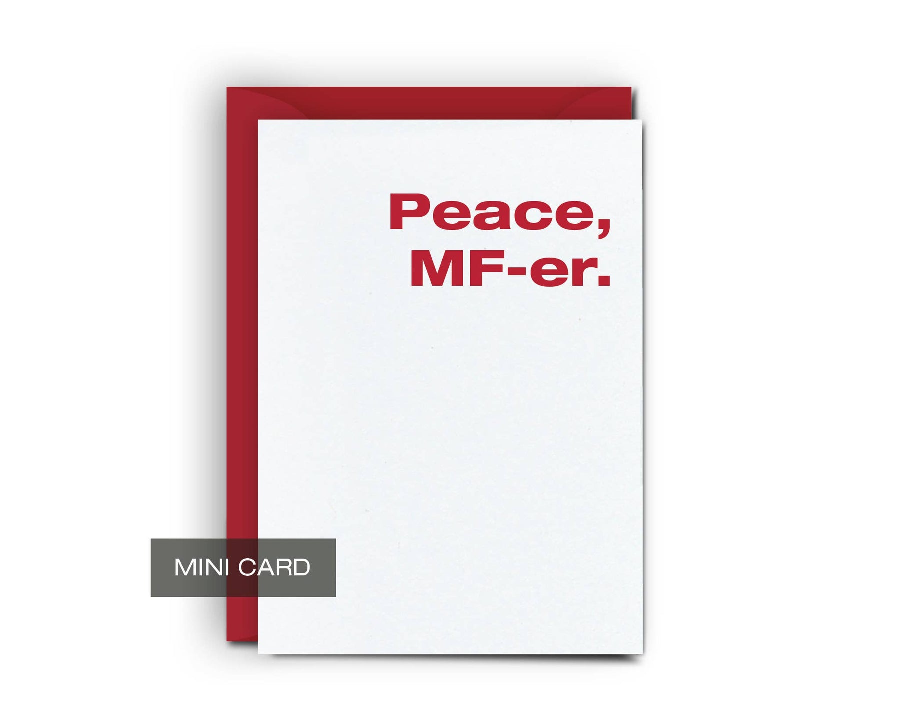 Peace MF-er - mini card / gift card holder for • Blank inside • Matching envelope • Cello-sleeved • Enclosure Card size: Folded: 2 9/16" x 3 9/16" • Envelope size: 2 11/16" x 3 11/16" ------ Funny Birthday Card, Funny Card, Funny Greeting Card, Snarky Friendship, Sarcastic Everyday, Mini Card, Gift Card Holder, Holiday, Christmas, Hanukkah