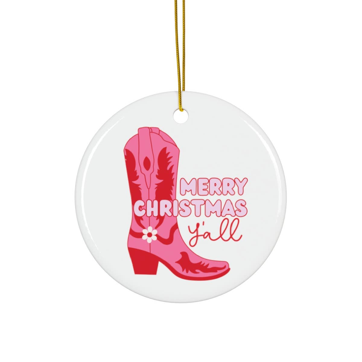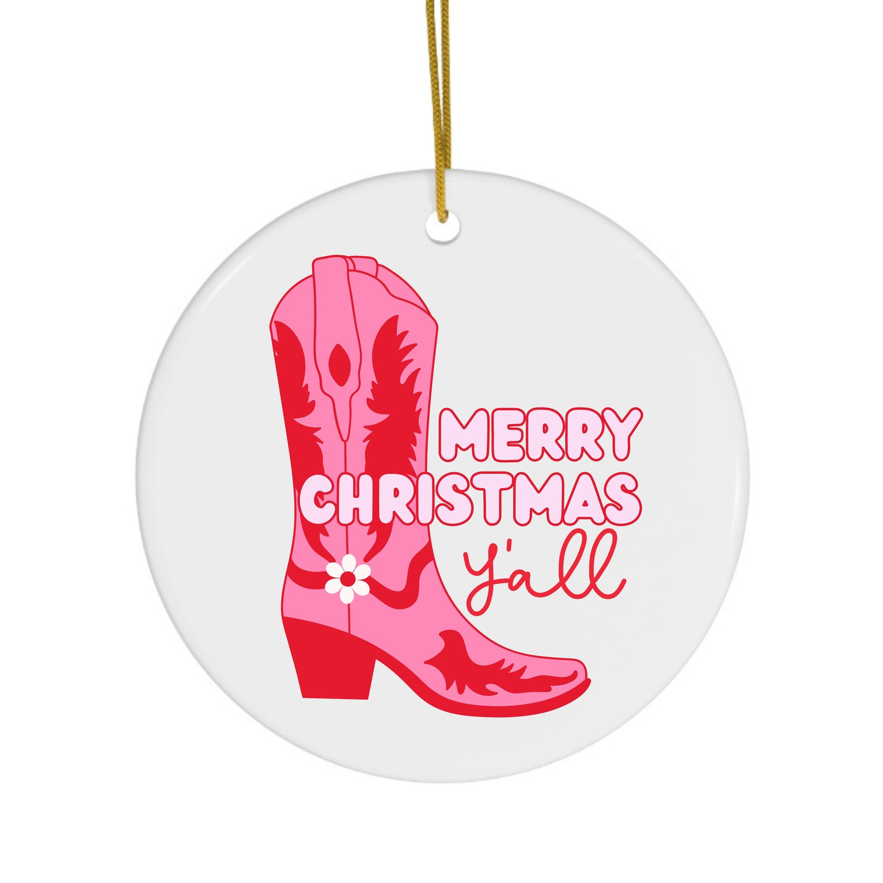 Merry Christmas Y'all Color: Pink and Red Round Ceramic Ornament with Gold String Measurements: 3 inches x 3 inches Add a touch of western to your customer's Christmas tree this year with our Cowgirl Boots Pink Ornament. Crafted with care, this cute and colorful ornament is bound to bring a smile to everyone's face.