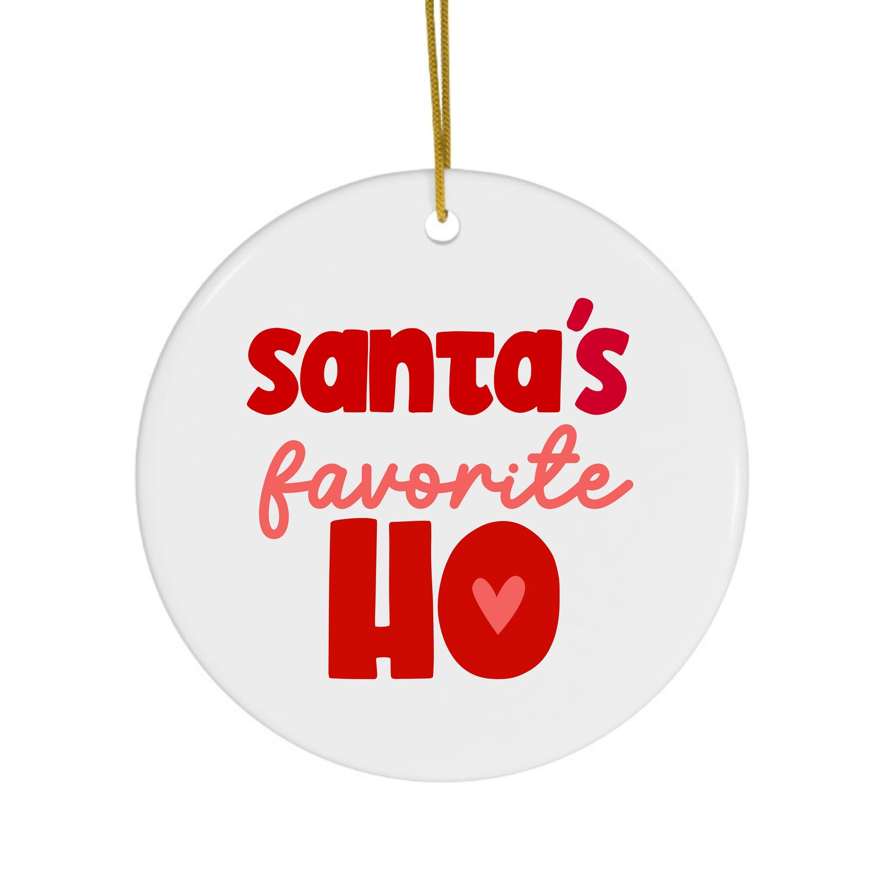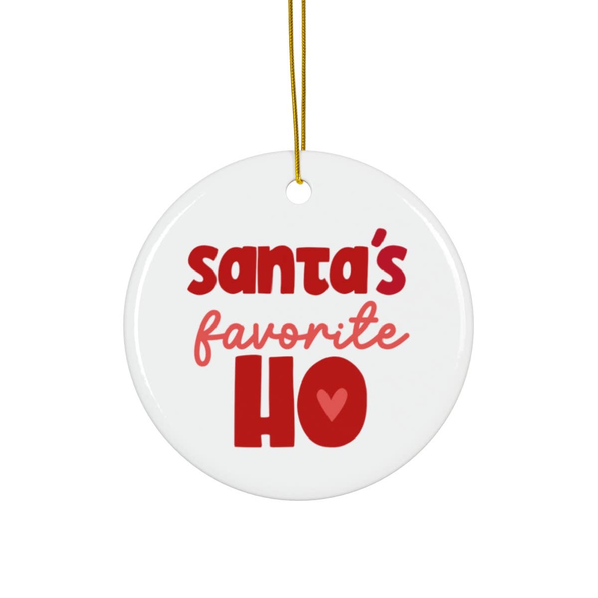 Santa's Favorite Ho Color: White and Red Round Ceramic Ornament with Gold String Measurements: 3 inches x 3 inches Add a touch of humor to your customer's Christmas tree this year with our Santa's Favorite Ho ornament. Crafted with care, this sassy and colorful ornament is bound to bring a smile to everyone's face.