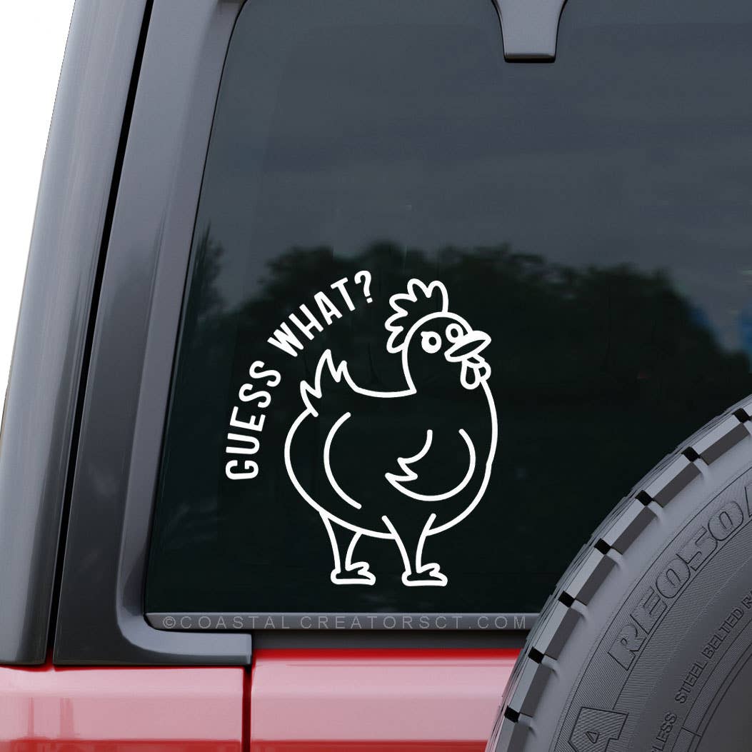 This white vinyl Guess What? Chicken Butt "transfer" car window sticker measures 4-1/2" wide x 5-1/4" high, is waterproof and comes in retail packaging ready to display. Stickers are a great way to enhance the appearance of a window, laptop, water bottle and more. Each sticker comes in retail packaging and includes full instructions for applying as well as a window prep pad. Each high quality car window sticker is made using vinyl rated for 6-year outdoor durability.