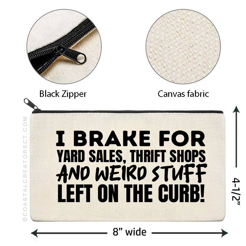 I brake for yard sales, thrift shops, and weird stuff left on the curb canvas zipper bag is individually packaged with or without a header card. Bags are unlined. Fabric is light beige canvas. Zipper is black. These canvas multi-purpose zipper bags measure approximately 8" wide x 4-1/2" high and feature a cute saying or design on the front. They are perfect for pencils, beauty products, stickers, and more plus they make great impulse items for your shop. Keywords: pouch, storage bag, mom, mother, family, children, kids, impulse, beach, ocean, camping, fishing, makeup, beauty, lipstick, thrifting, thrift shop, shopping, funny