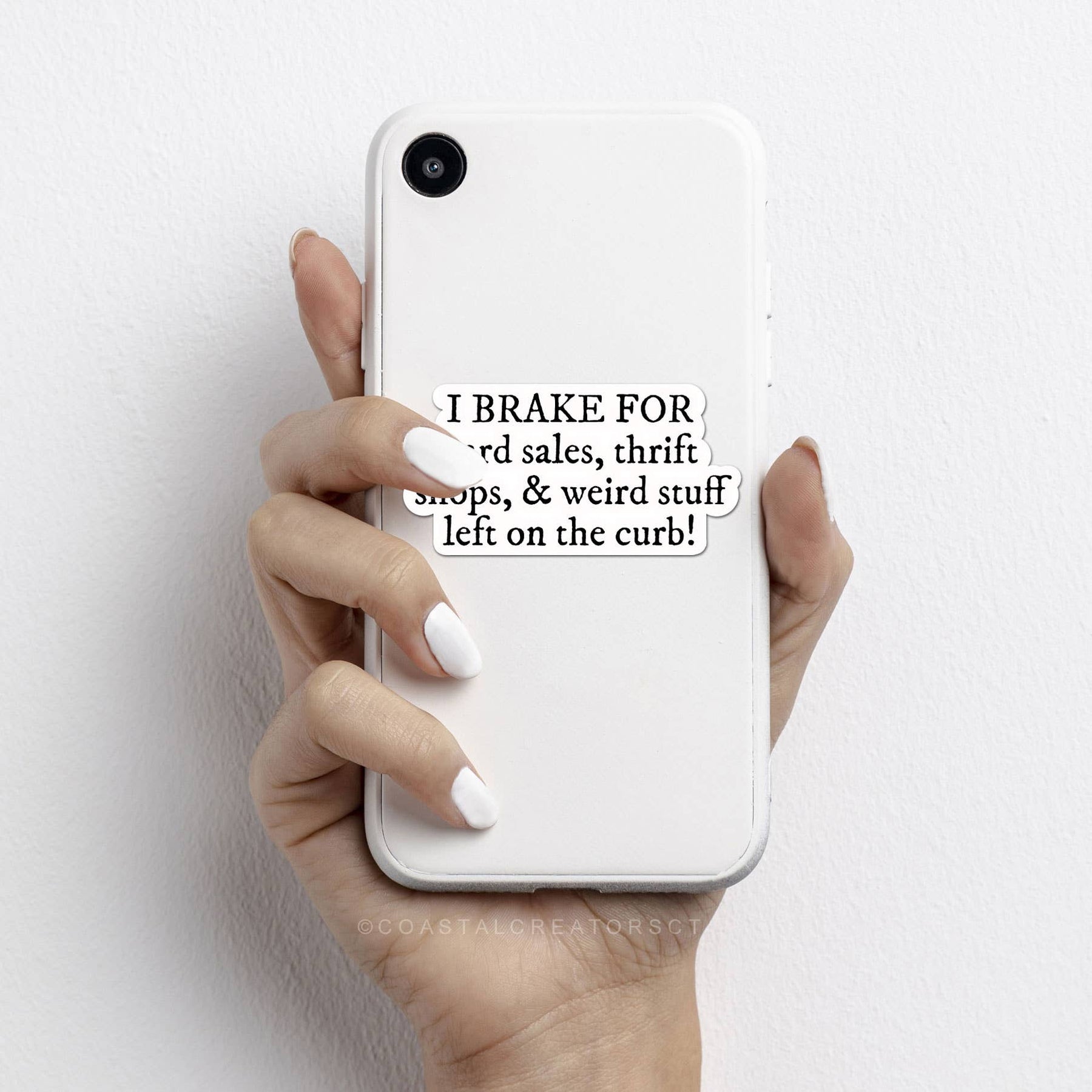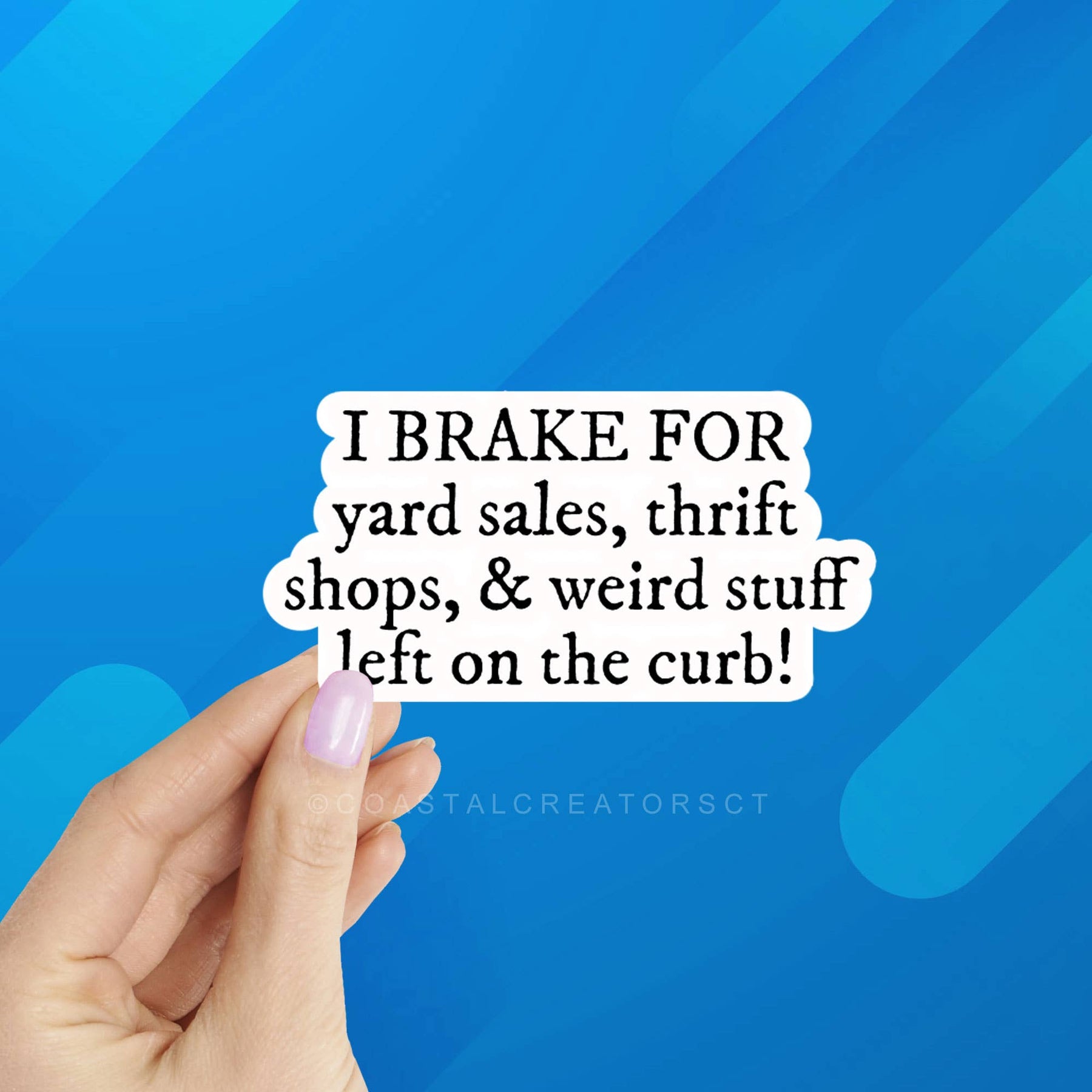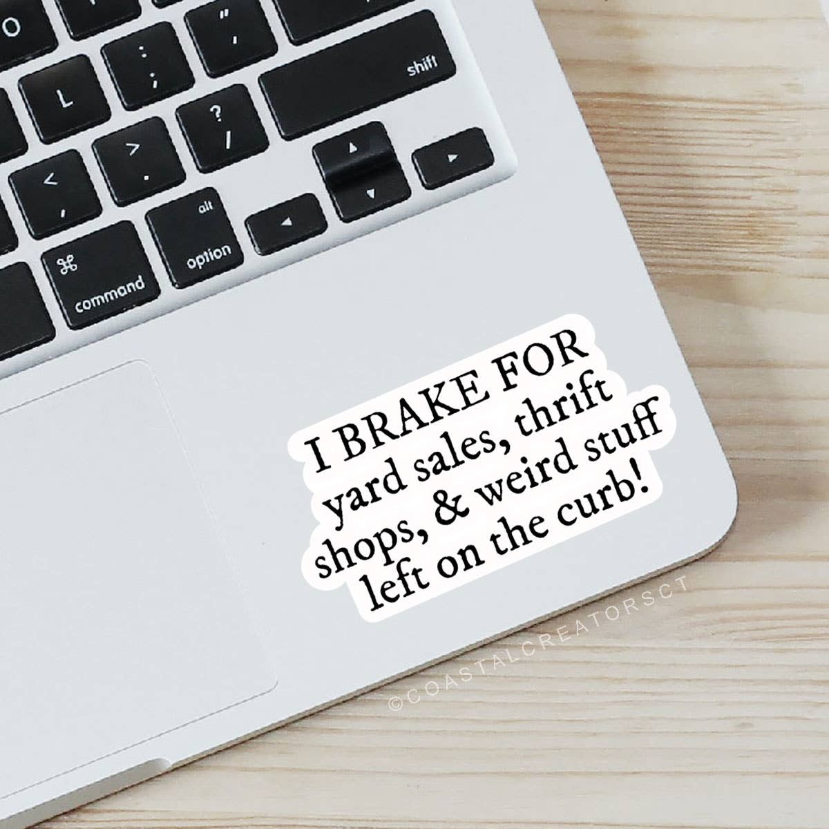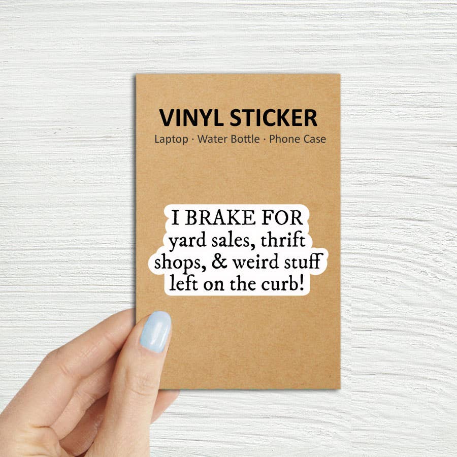 This laptop sticker measures 3-1/2" wide x 2" high, and has a matte finish. The sticker is waterproof so you can put it on your water bottle (top rack only). Vinyl diecut stickers are great to put on a laptop, water bottle, phone or Kindle case, journal, tumbler, or collect and trade with your friends. Easy to remove. Saying: I brake for yard sales, thrift shops, and weird stuff left on the curb! Funny stickers, waterproof stickers, water bottle sticker, phone case sticker, Kindle decals, journal sticker, tumbler sticker, collectible stickers.