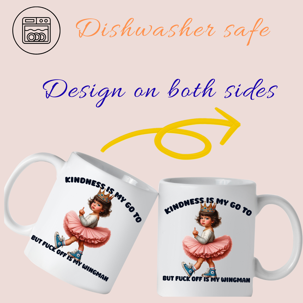 Gift Mug Kindness is my go to by F off is my wingman. Crafted from durable white ceramic with a glossy finish, this mug is ideal for boutiques, gift shops, holiday pop-ups, and stores seeking lighthearted, seasonal merchandise. Great for hot cocoa, coffee, or eggnog, it makes a perfect stocking stuffer, hostess gift, or impulse-buy item. Features: Premium ceramic mug Vibrant, high-resolution holiday artwork Funny sassy girl design with Salty but Sweet Saying Dishwasher & microwave safe Perfect for Christmas gifting, winter displays, and seasonal retail A fun, eye-catching addition that brings holiday humor to every shelf!