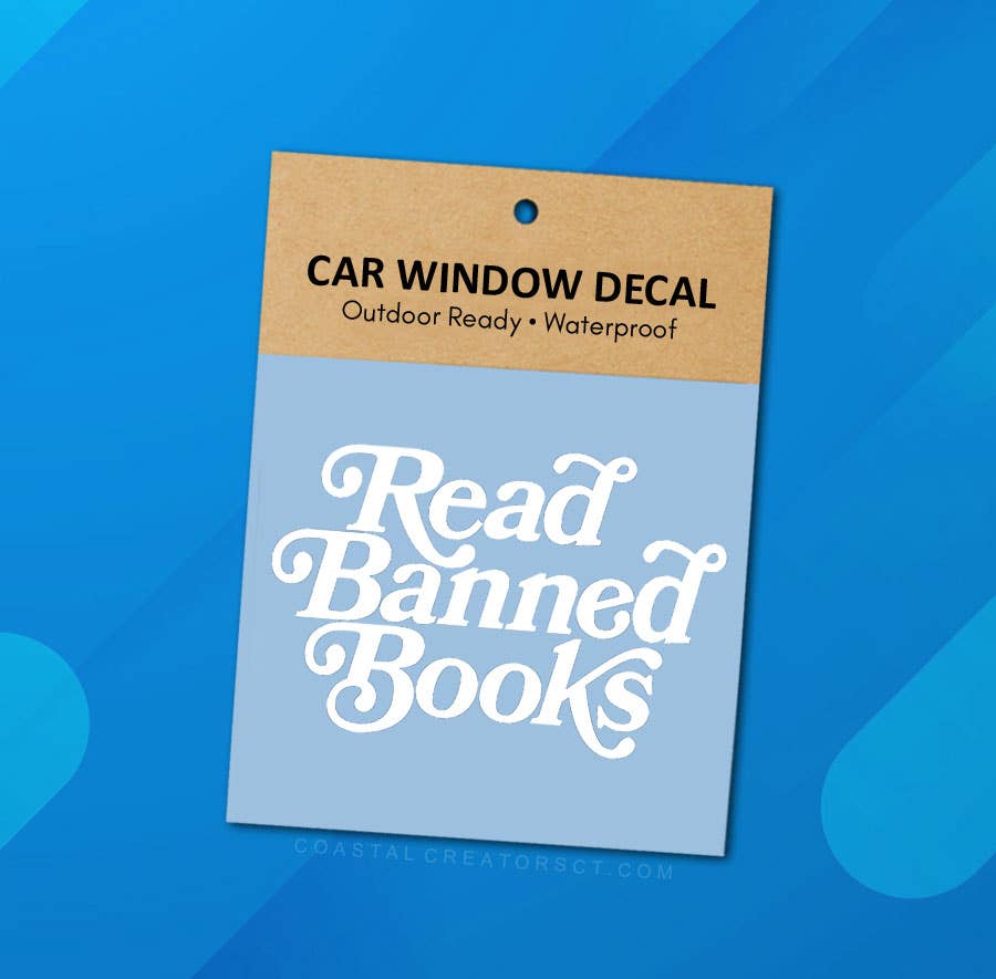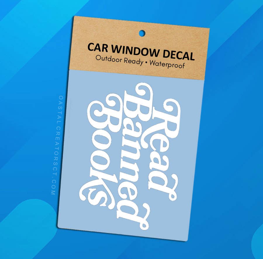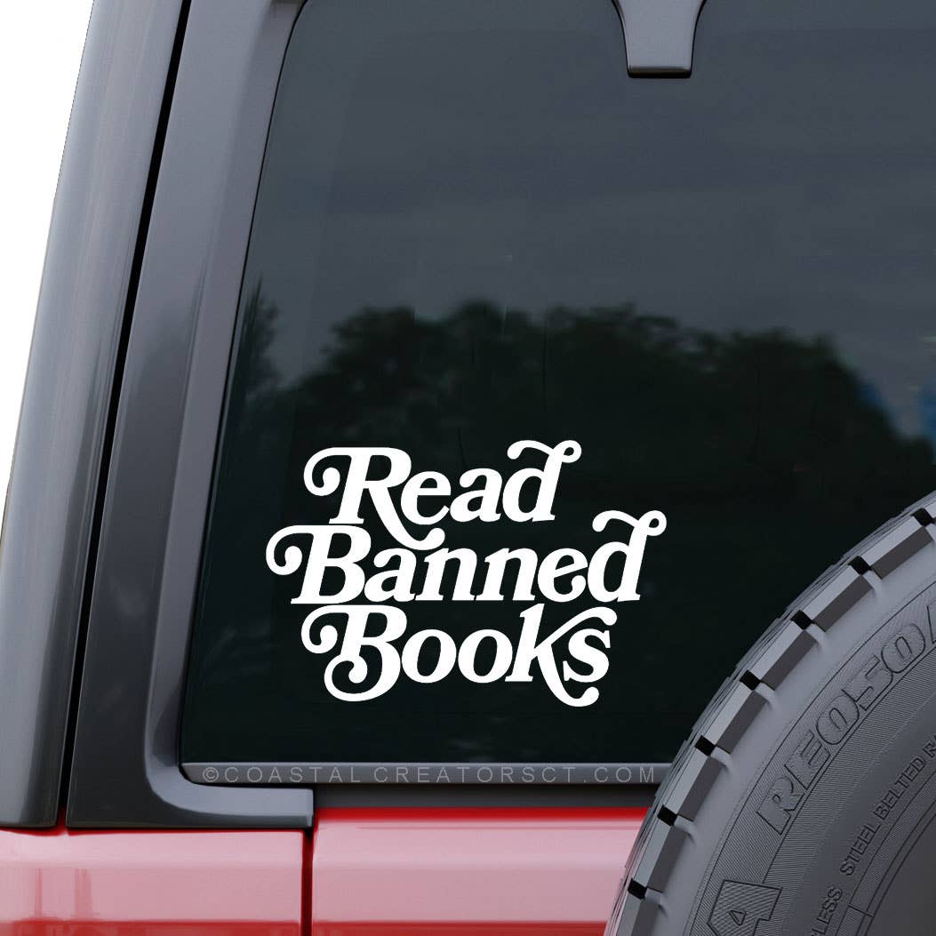 This white vinyl Read Banned Books "transfer" car window decal is waterproof and comes in retail packaging and comes in retail packaging with a surface cleaning pad. Ready to display. There are two sizes to choose from. Large: measures 6" wide x 4" high Stickers are a great way to enhance the appearance of a window, laptop, water bottle and more. Each high quality car window sticker is made using vinyl rated for 6-year outdoor durability.