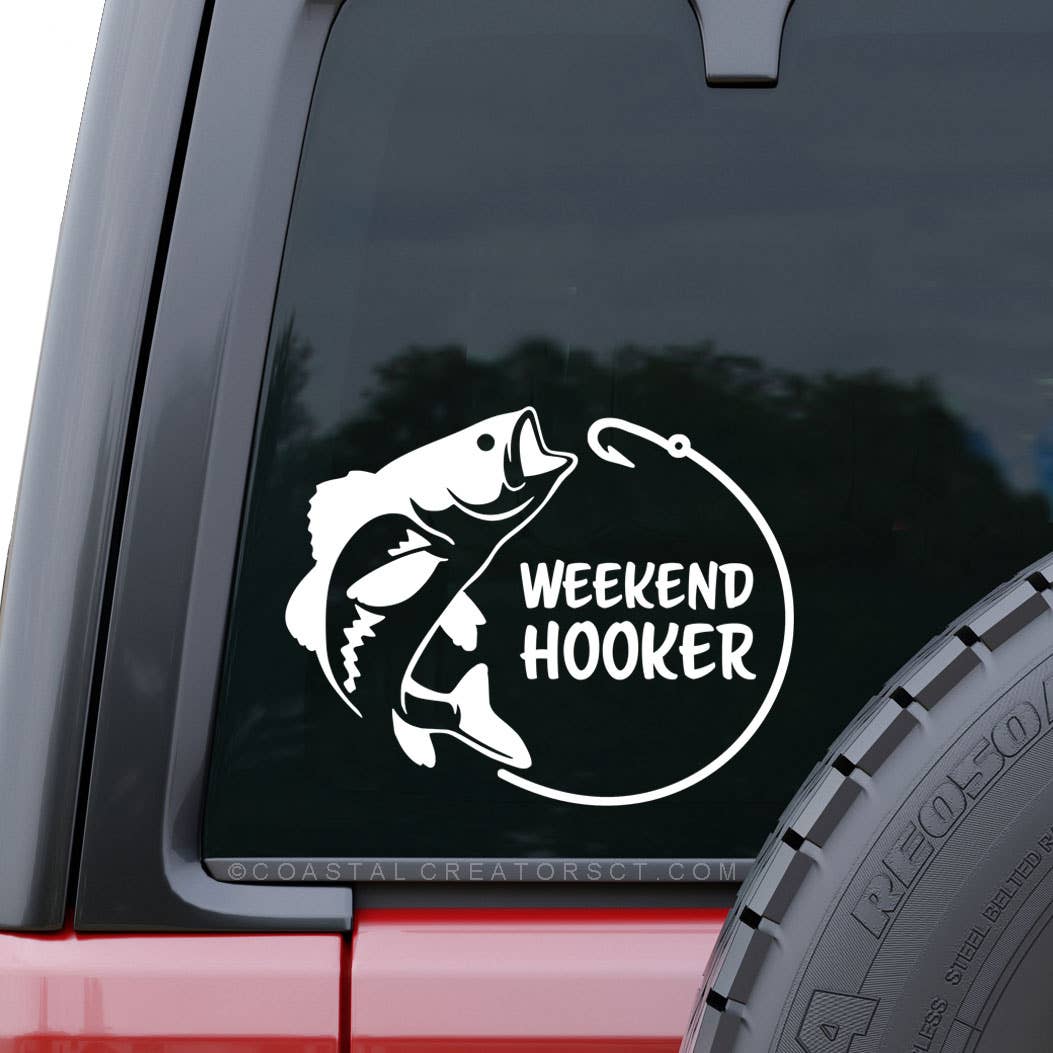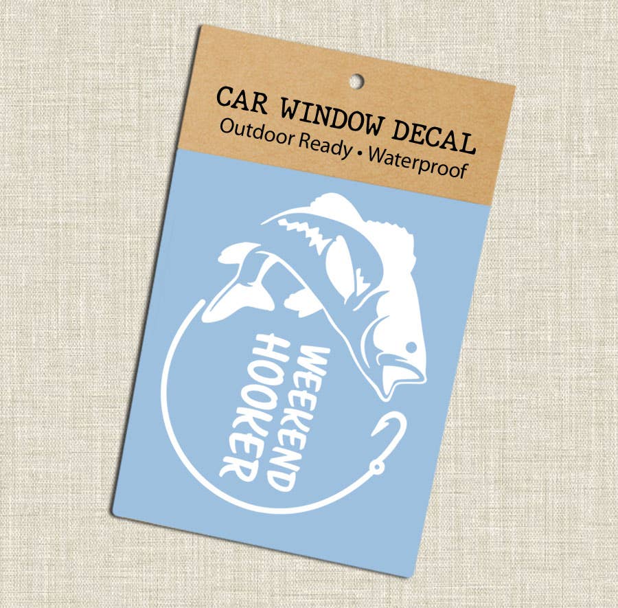 This white vinyl weekend hooker fishing "transfer" car window sticker measures 5-1/2" wide x 4" high, is waterproof and comes in retail packaging ready to display. Stickers are a great way to enhance the appearance of a window, laptop, water bottle and more. Each sticker comes in retail packaging and includes full instructions for applying as well as a window prep pad. Each high quality car window sticker is made using vinyl rated for 6-year outdoor durability.
