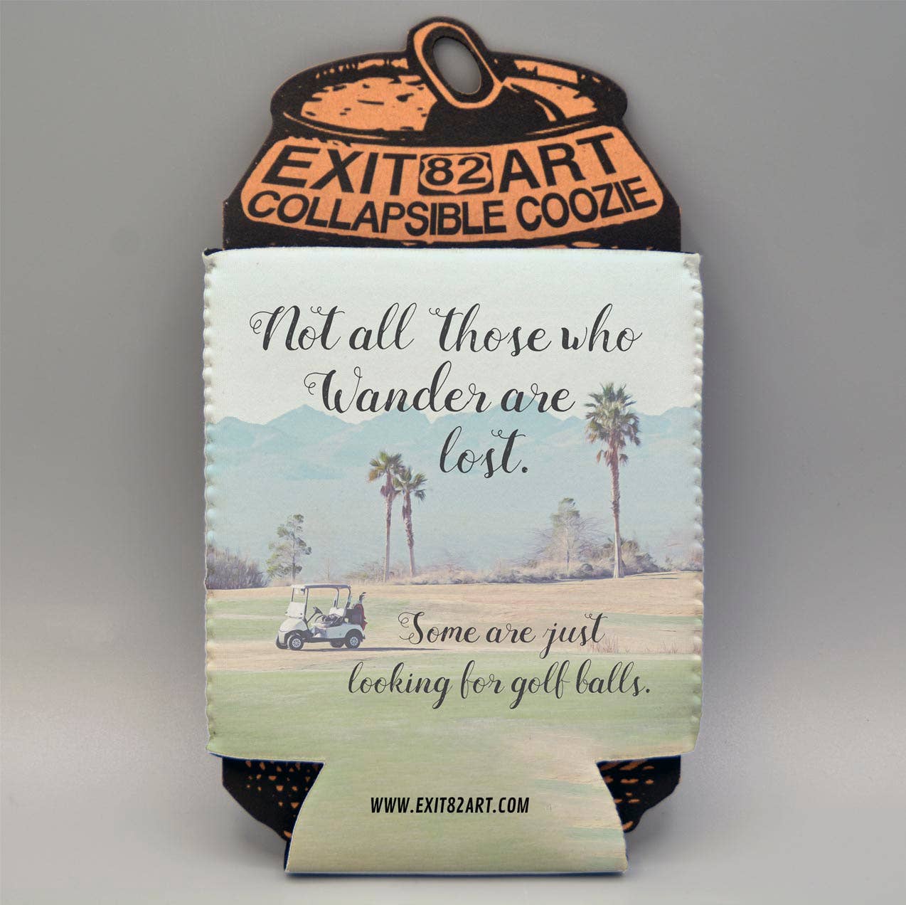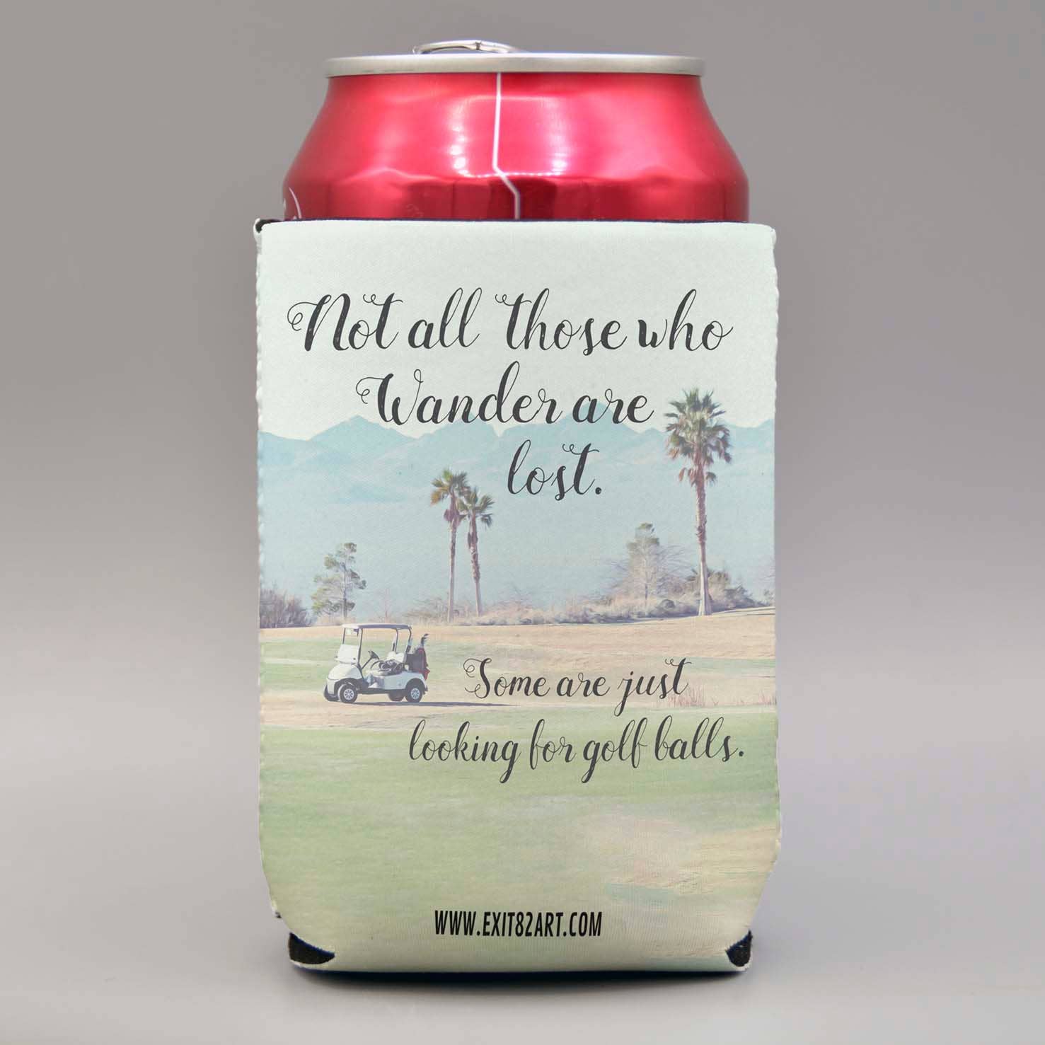 Not all who wander are lost. Some are just looking for golf balls." Keep your drinks chill and your vibe cooler with a one-of-a-kind drink coozies. Each piece features original, eye-catching artwork that ranges from clever pop culture references to quirky retro designs — all printed in vibrant color on durable neoprene. Whether you're sipping at a backyard BBQ or selling out at your next craft market, these coozies are conversation starters.