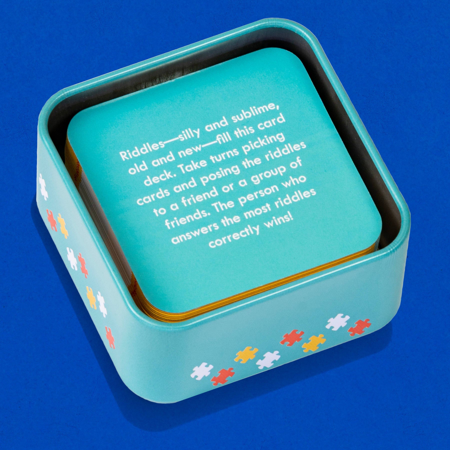 What's the perfect boredom buster for any occasion, be it a cozy night at home or a long family road trip? A riddle! And this irresistible little tin contains 50 of them. • tin box with lift-off lid: 2-1/4" x 2-1/4" x 1-1/4" • 51 cards: 2" x 2" • full-color throughout • for 2 or more players