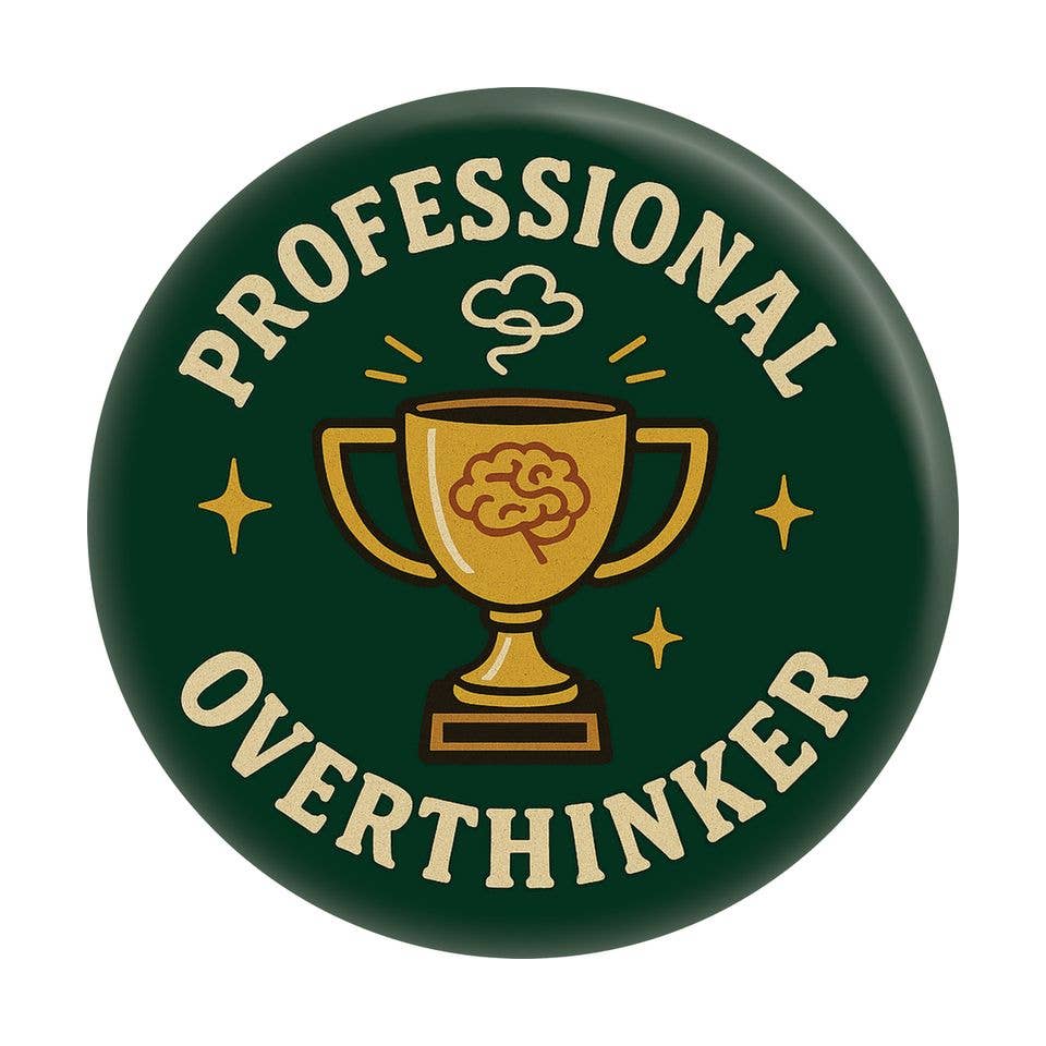 This 1.25-inch round button proudly awards you the title of "Professional Overthinker". Featuring a golden trophy with a brain on it, it's perfect for anyone who's ever replayed a conversation from 2013 or stayed up all night wondering if that text sounded weird. You've earned this - and you'll definitely spend an hour deciding where to pin it. Wear it with pride on your bag, jacket, or existential dread. Proudly made in the USA.