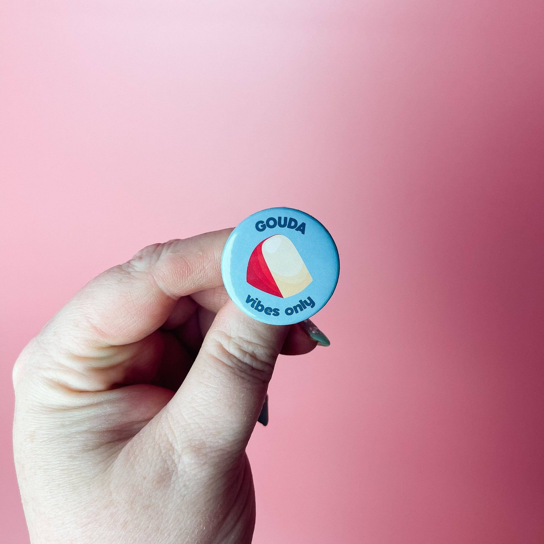 Our new button pin is the perfect way to express your cheese-y personality! Featuring a witty pun, this pin is sure to make everyone chuckle. The pin is made with durable metal and has a bright, glossy finish that will look great on any garment or accessory. Whether you wear it to show your love for cheese or just for a laugh, this pin is sure to make you stand out from the crowd! SIZE: 1.25" diameter NOTE: Monitors differ meaning the colors seen on screen may vary or appear slightly different in person.