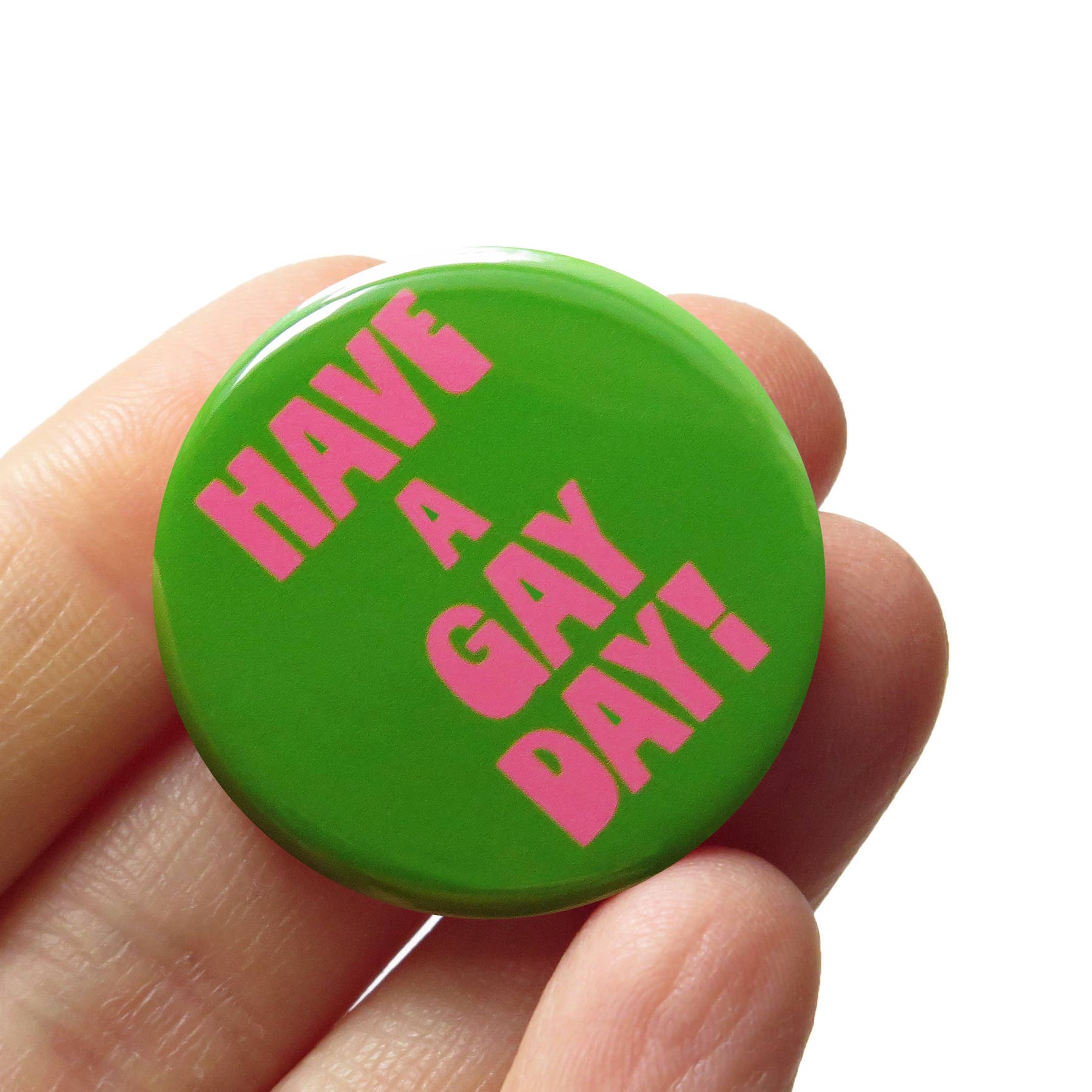 HAVE A GAY DAY! Social Alert Pinback Button Cute register gift for queer bookstores & shops - 1.25" pinback buttons - Deep lime green background with bright pink text - Designed & pressed in our Los Angeles studio - Sold loose in quantities of six - Vivid color, but may vary slightly by device viewed on