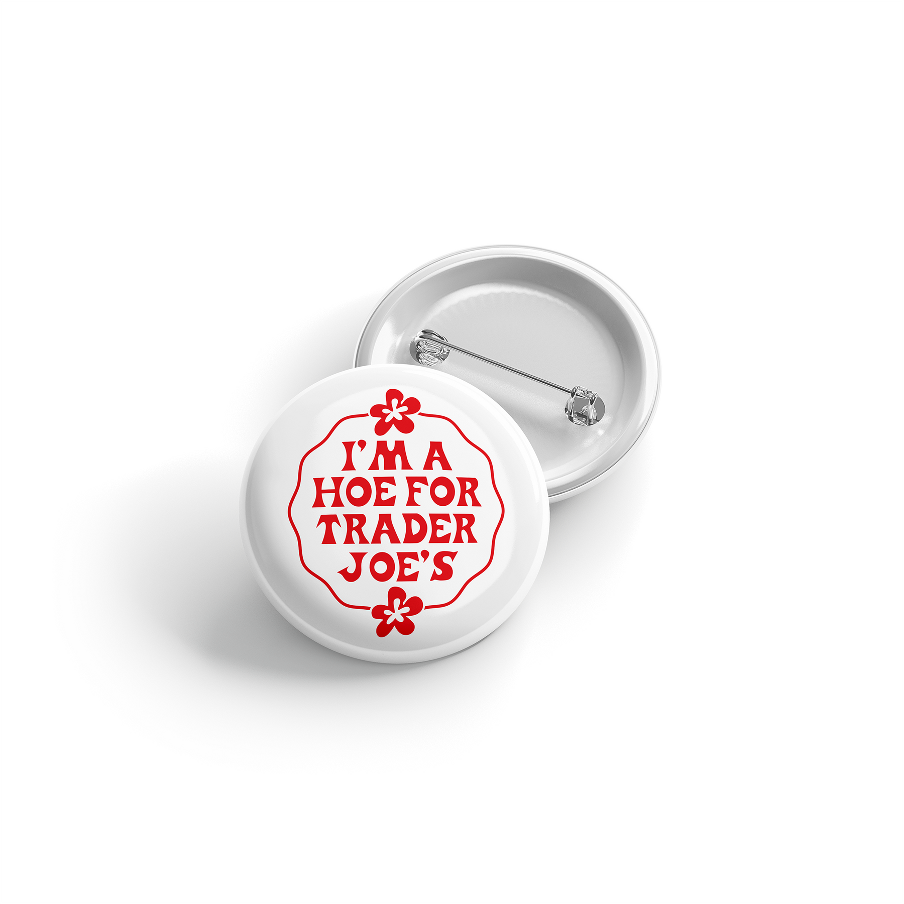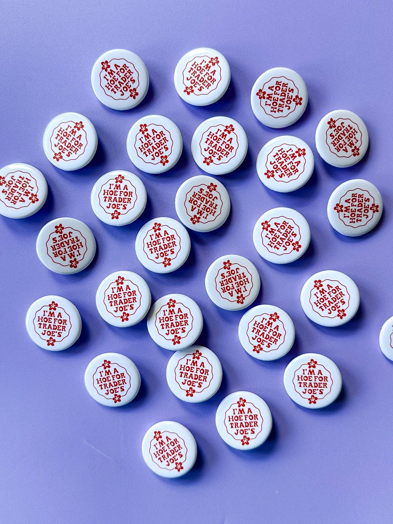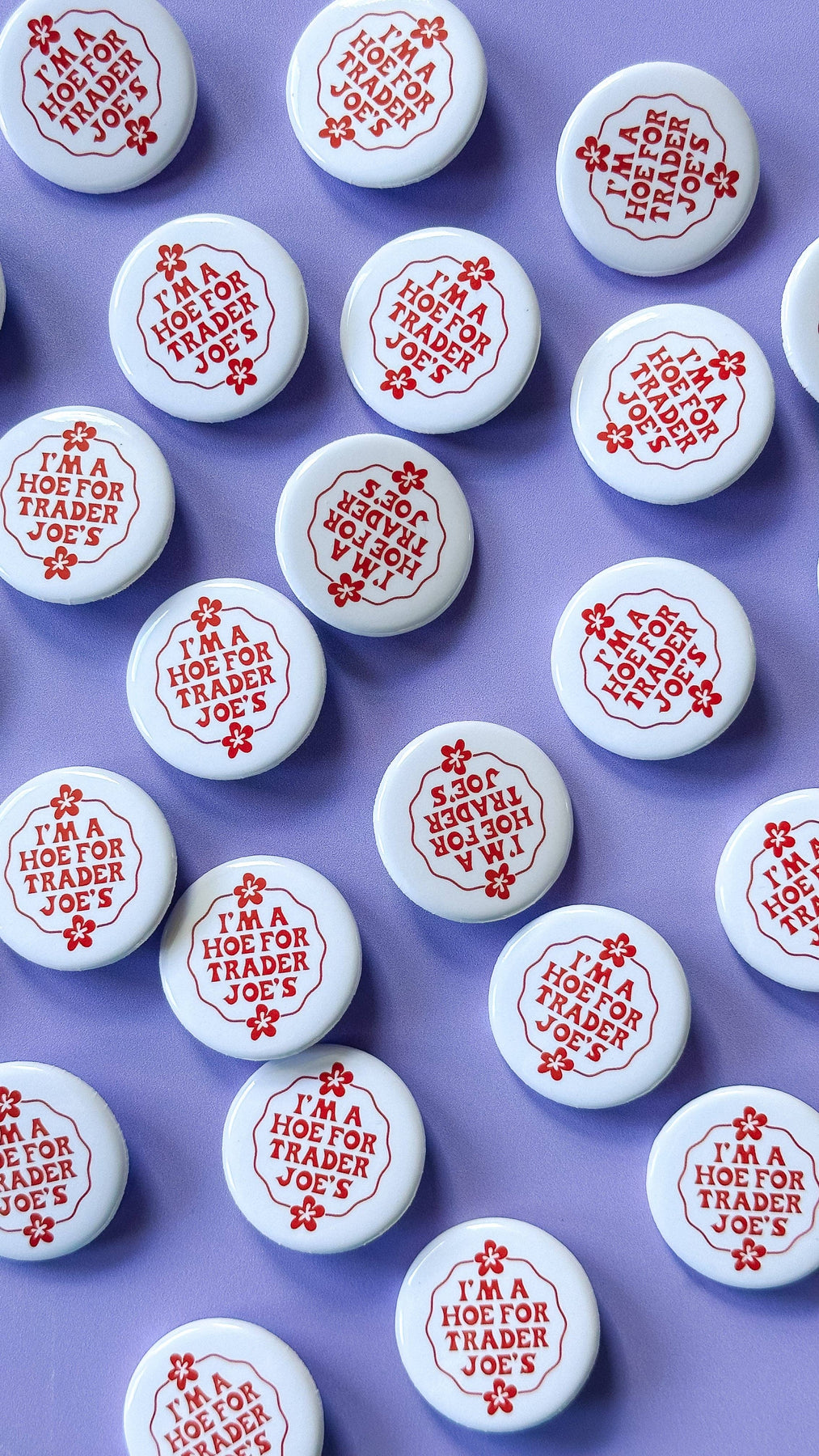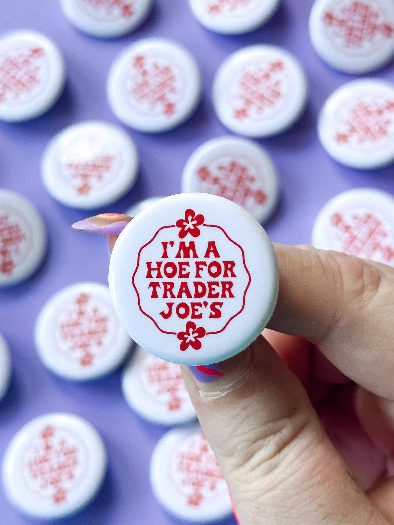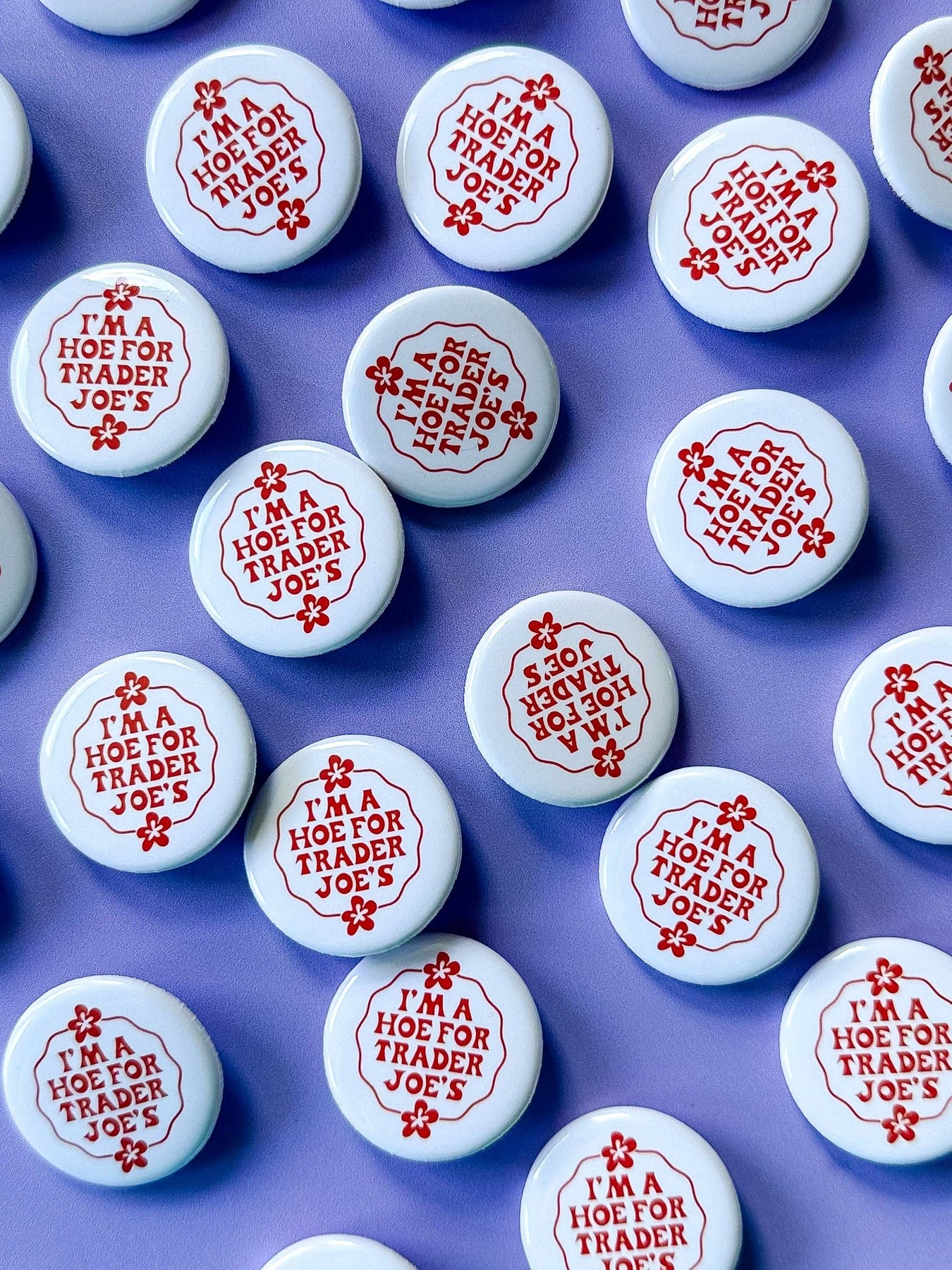 Everyone's favorite sticker is now a button! So, if you find yourself constantly tempted by Trader Joe's delectable treats and unique selections, this sticker is a must-have. Let the world know that you're proud to be a "Hoe for Trader Joe's" and embrace your love for all things TJ's. Order now and join the ranks of loyal fans who just can't get enough of this beloved grocery store! SIZE: 1.25" diameter NOTE: Monitors differ meaning the colors seen on screen may vary or appear slightly different in person.