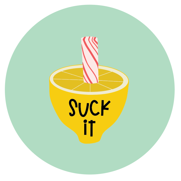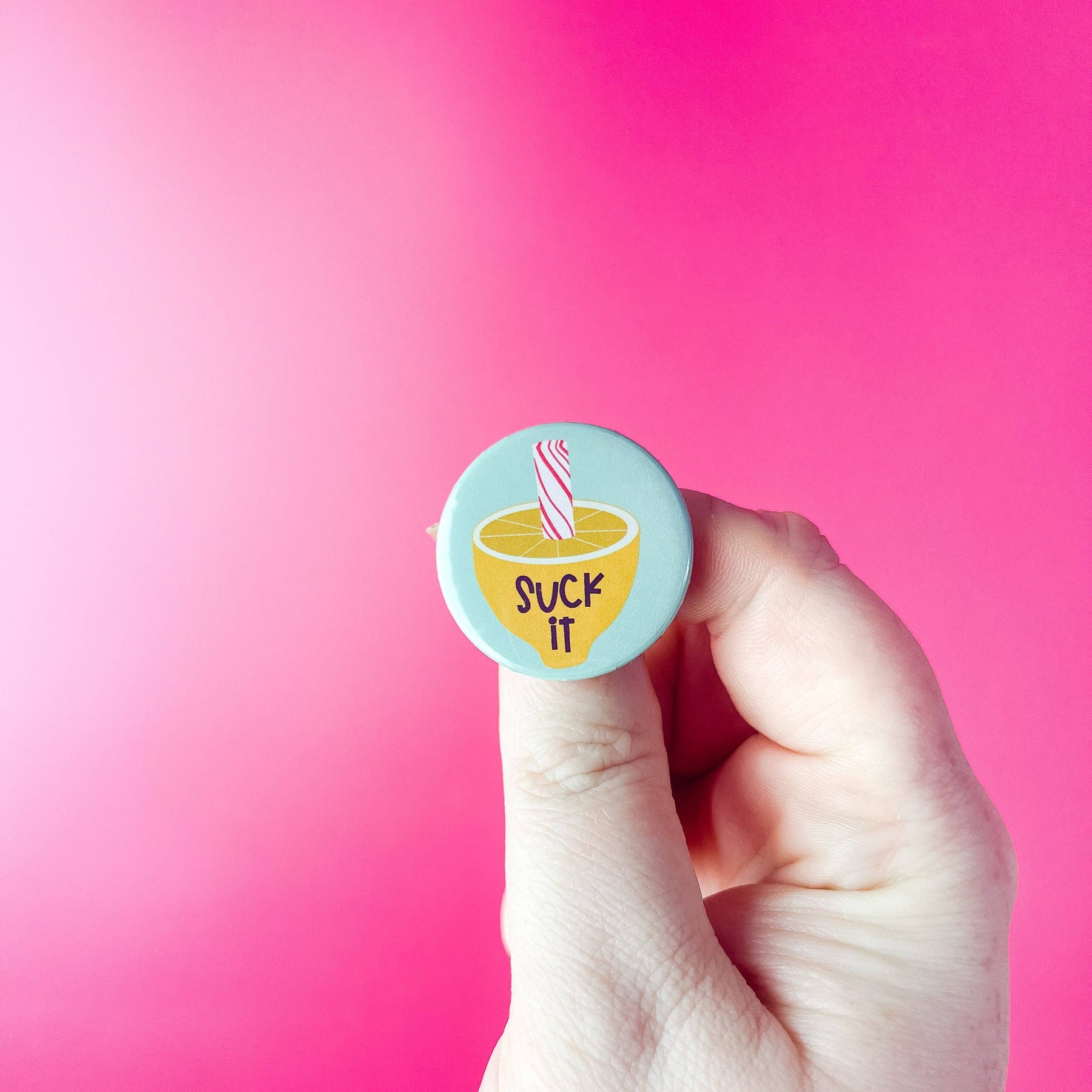 Featuring a vibrant illustration of a Lemon Peppermint Stick with the phrase "Suck It," this button is sure to make anyone smile. SIZE: 1.25" diameter NOTE: Monitors differ meaning the colors seen on screen may vary or appear slightly different in person.