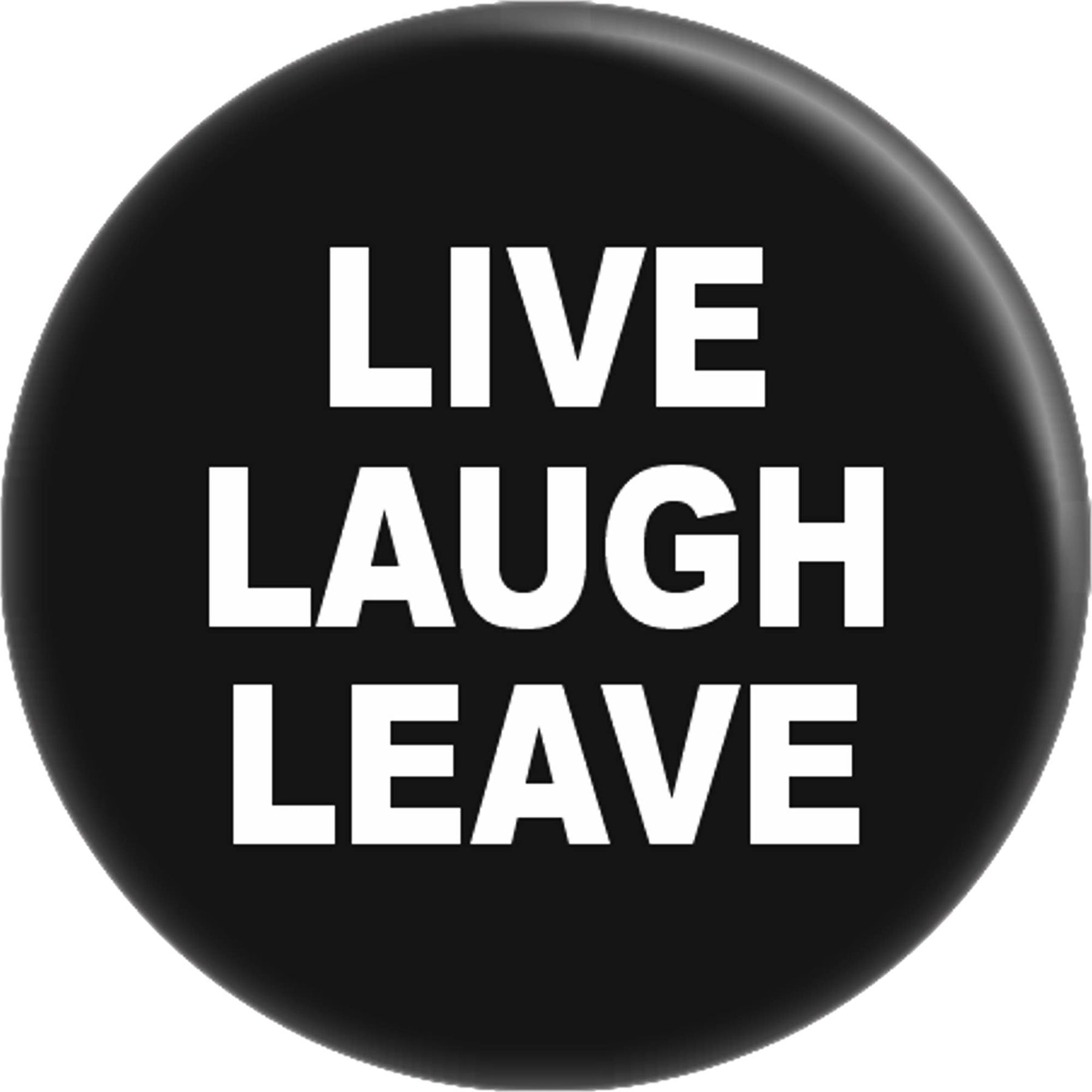 LIVE LAUGH LEAVE This 1.5 inch pin-back button features bold white text on a black background that reads LIVE LAUGH LEAVE. It's a snarky twist on the classic home decor mantra - perfect for introverts, realists, or anyone who's over it before it begins. Great for work lanyards, backpacks, or as a not-so-subtle hint at parties. Makes a perfect gift for your favorite anti-social icon. Proudly Made in USA.