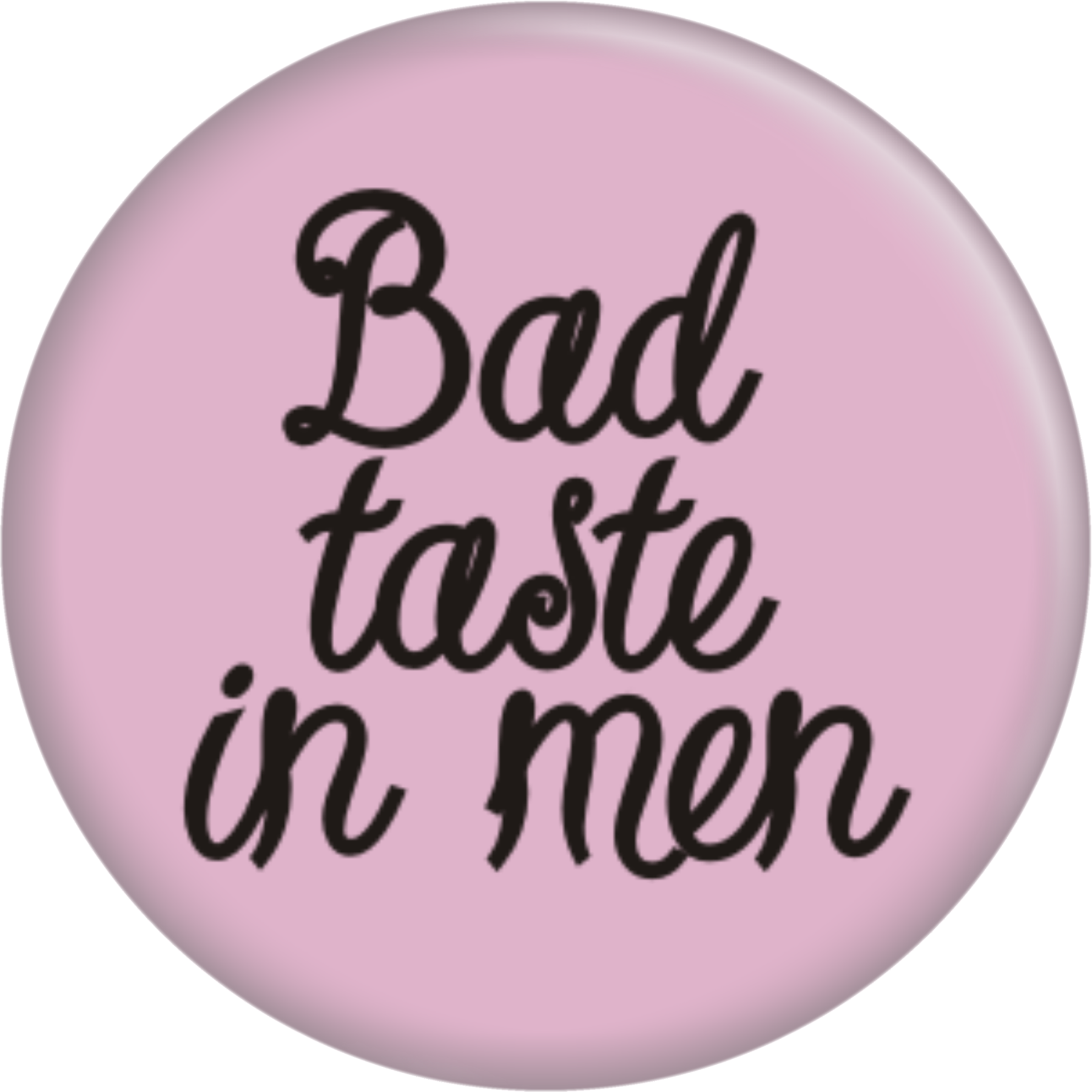 Bad Taste in Men (black on pink) This 1 inch pin-back button features playful black script text that reads Bad taste in men on a soft pink background. A humorous and cheeky admission that everyone can relate to. Perfect for anyone with a self-deprecating sense of humor, a flair for honesty, or just looking for a fun conversation starter. A cute and clever accessory. Proudly Made in USA.
