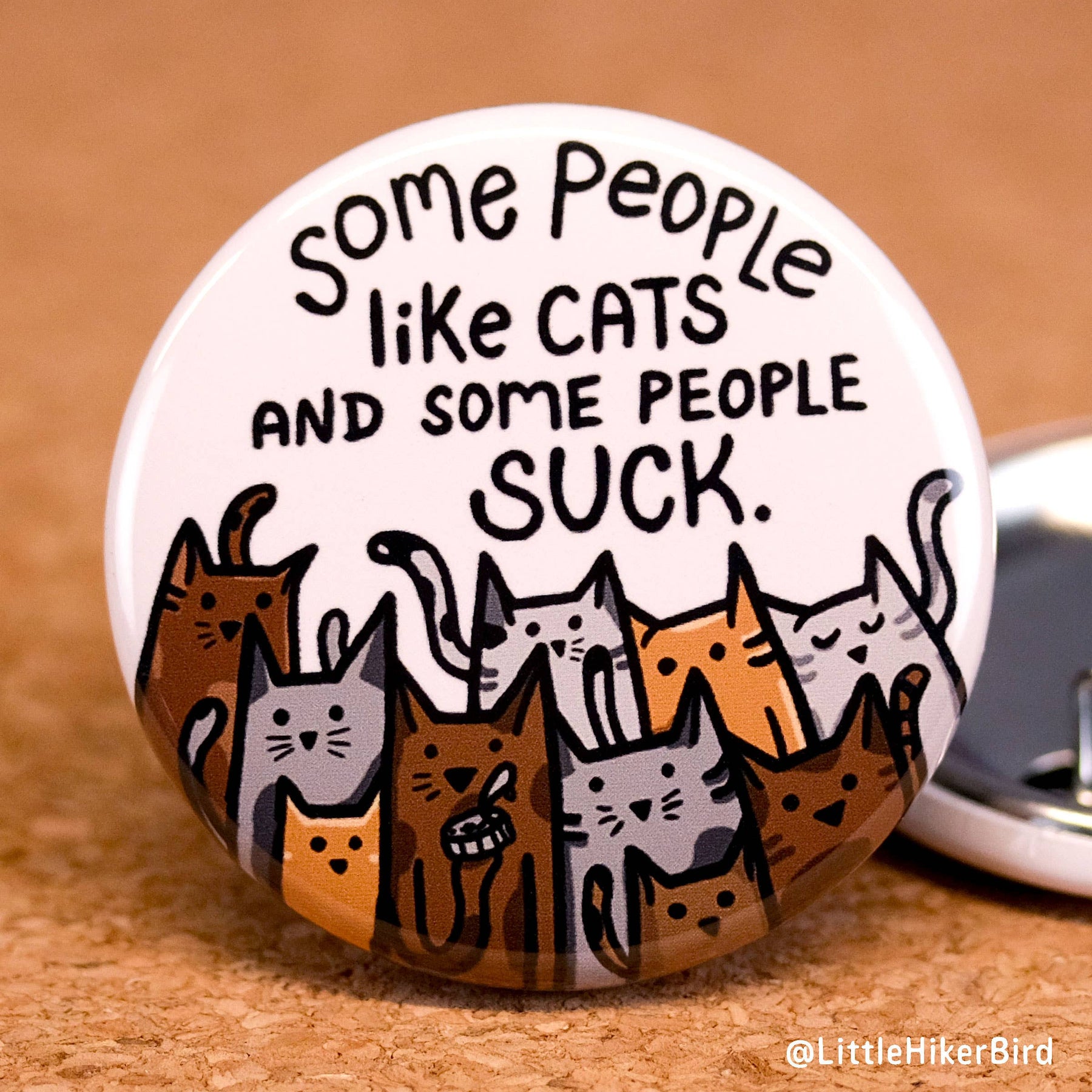 This 1.5" button pin shows the phrase "Some people like cats and some people suck". Button pins arrive loose without product packaging. They are best displayed in a single layer inside of a shallow decorative bowl or plate. They sell best when placed near the register.