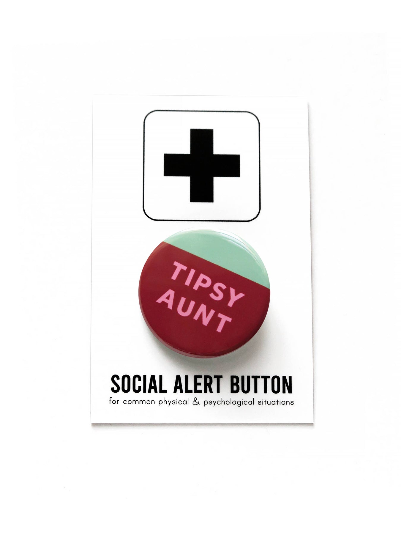 TIPSY AUNT - SOCIAL ALERT BUTTON Fun gift for wine shops & boutiques For all the fun tipsy aunts, and especially those who are also Childless Cat Ladies! • 1.25" pinback buttons • Designed, pressed & packaged in our Los Angeles, California studio • Affixed to a sturdy Social Alert backing card • Sealed in a clear cello sleeve with hang tab • Color may vary slightly by device viewed on