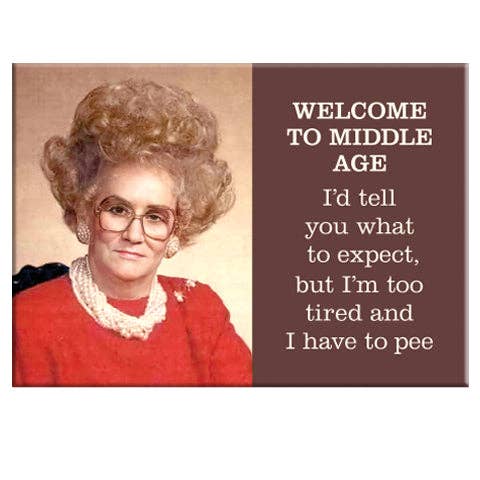 Welcome to middle age. I'd tell you what to expect but I'm too tired and I have to pee. Rectangle magnet by Ephemera. * 2.5" x 3.5" with flexi-ceramic magnetic back. * USA made with recycled paper & steel. * Hand-pressed by Badge Bomb in Portland, OR. All purchases support 1% For The Planet!